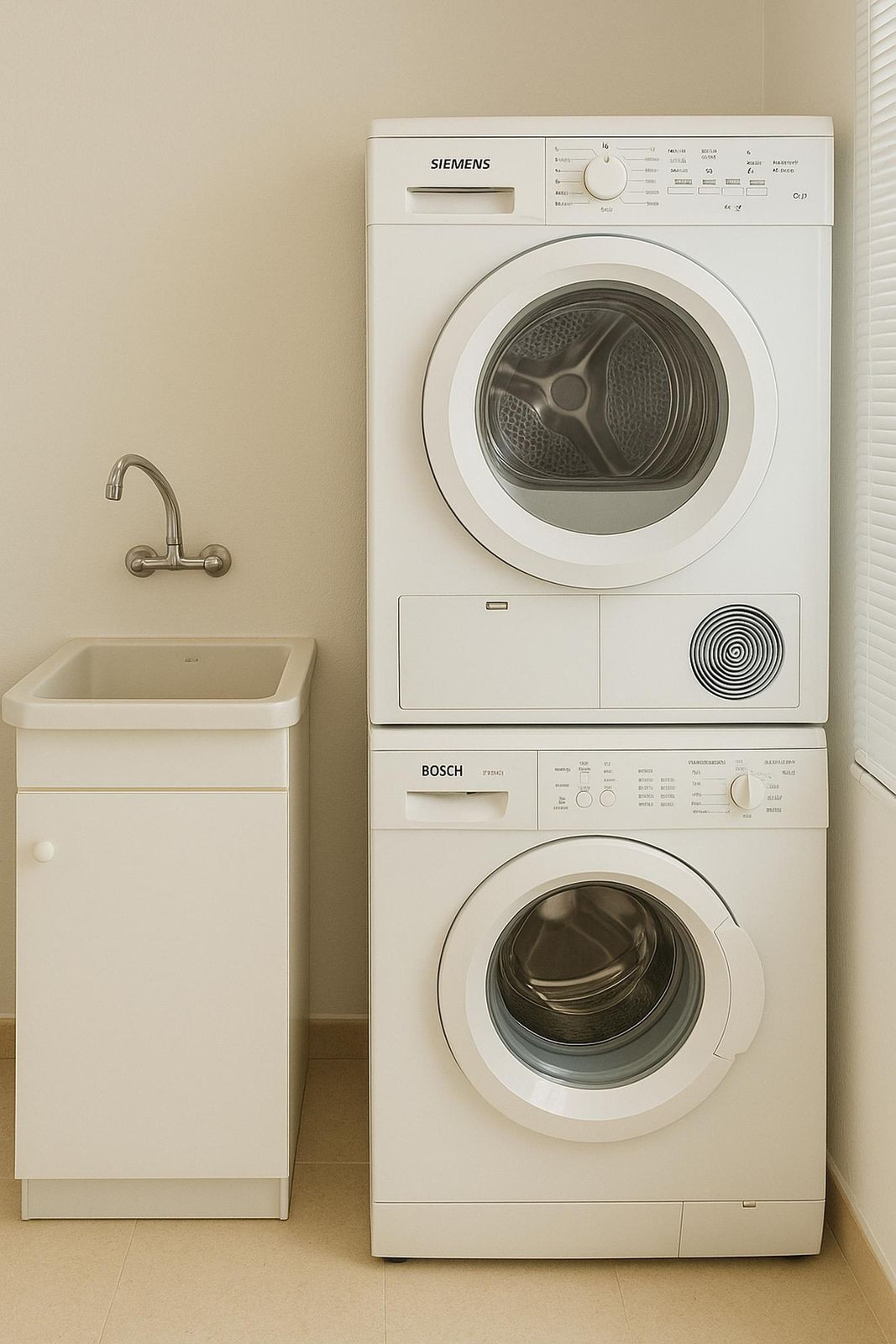 The bright and airy living room features a dedicated dining area and opens seamlessly onto the terrace through wide sliding glass doors, flooding the space with natural light. The separate kitchen is fully equipped with high-quality Bosch appliances, including a fridge-freezer, oven, dishwasher, electric hob, and extractor fan. A separate utility room houses the washing machine and dryer for added convenience.