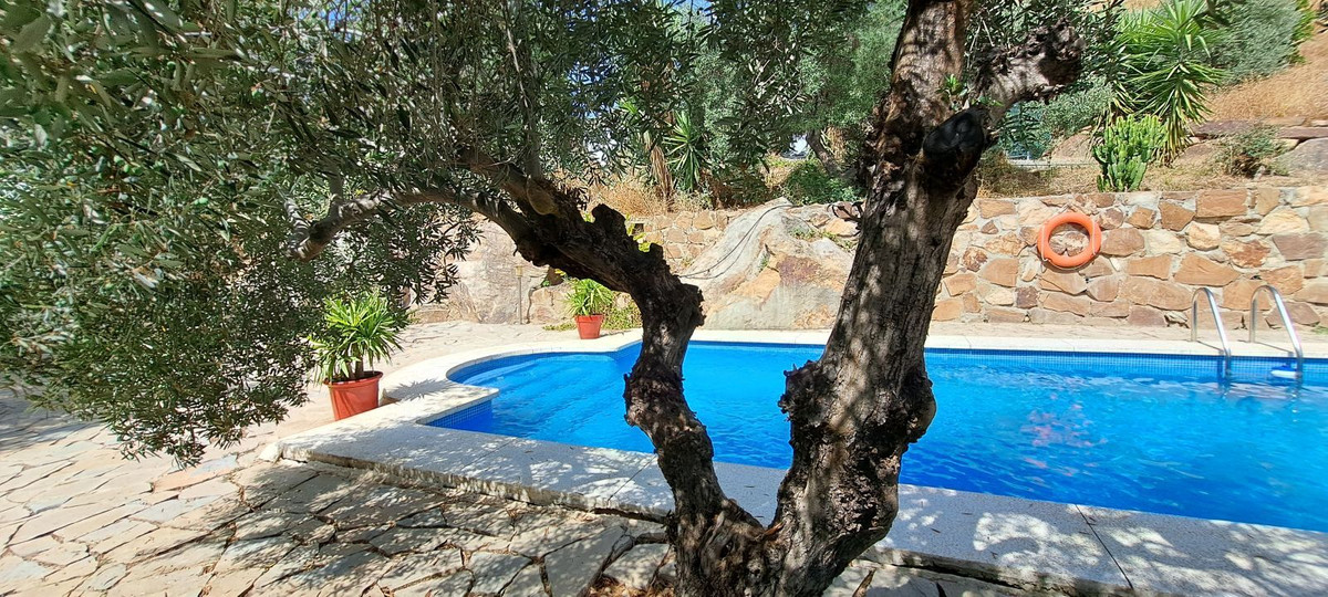 The swimming pool (8x4 M) is surrounded with a large stone built terrace, olive trees and yuccas and offers breathtaking views over the valley. An unusual and beautiful feature are the natural rock walls surrounding the terrace creating an enchanting oasis to enjoy the tranquillity of this area.