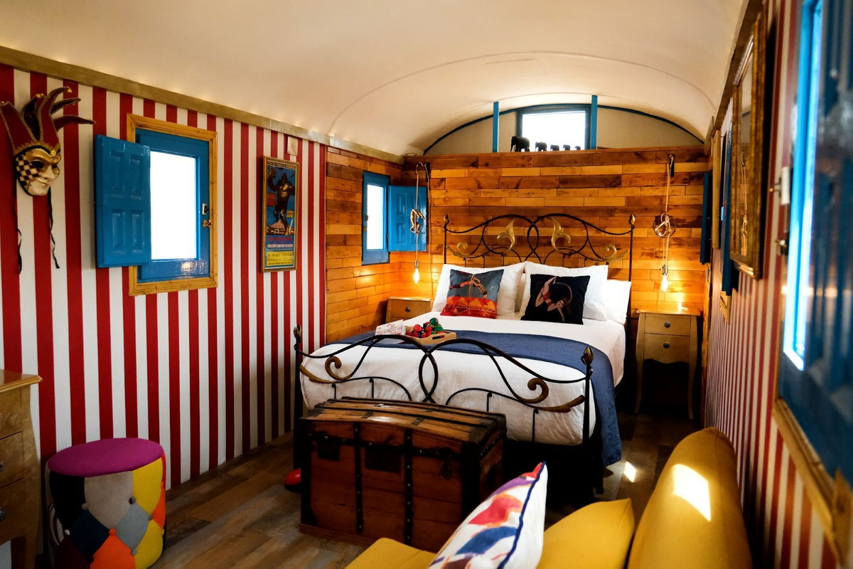 Retaining all its original features, this circus wagon has been restored and features a super comfortable luxury double bed, dining area, sofa and a stylish fully equipped kitchen with all modern conveniences.