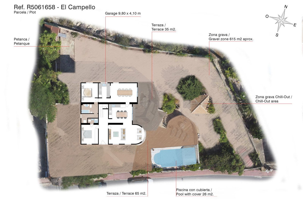 The landscaped plot offers complete privacy, particularly around the pool area, which features 65 m² of sun terraces. The private pool includes a cover for year-round use. Additional highlights include a shaded dining area, a pétanque court, and low-maintenance gravel landscaping.