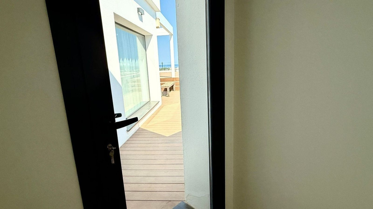 This exquisitely crafted contemporary villa situated within a gated community presents breathtaking sea views and an open-concept living space filled with natural light. The floor-to-ceiling glass windows lead out to the terrace.