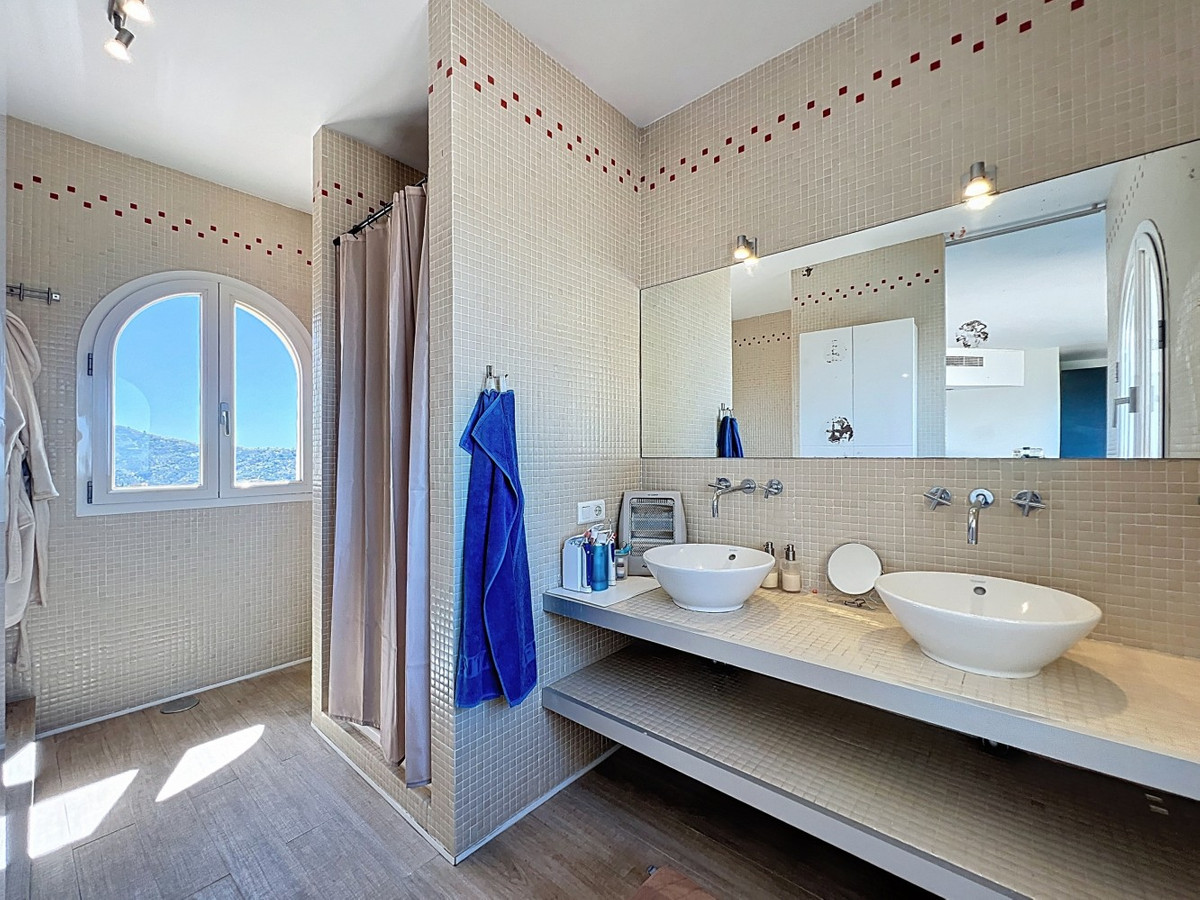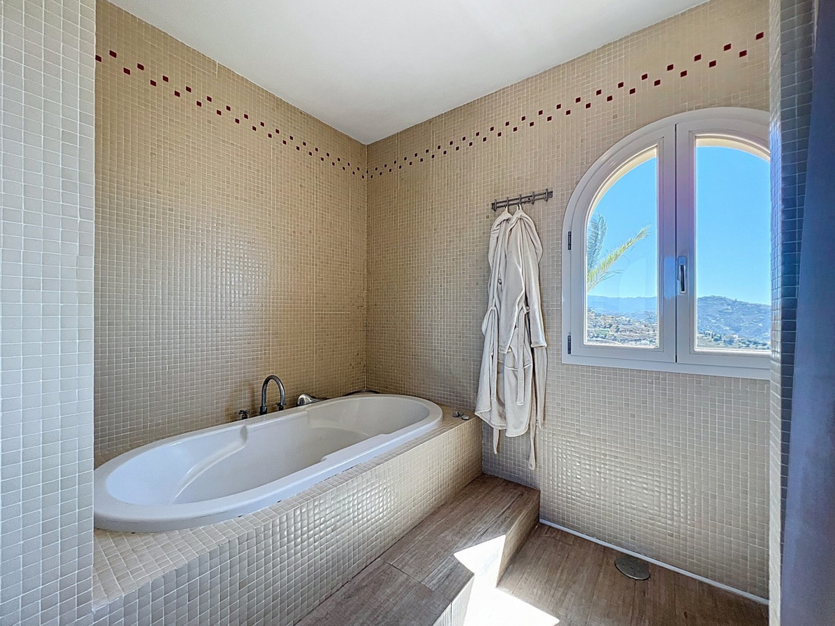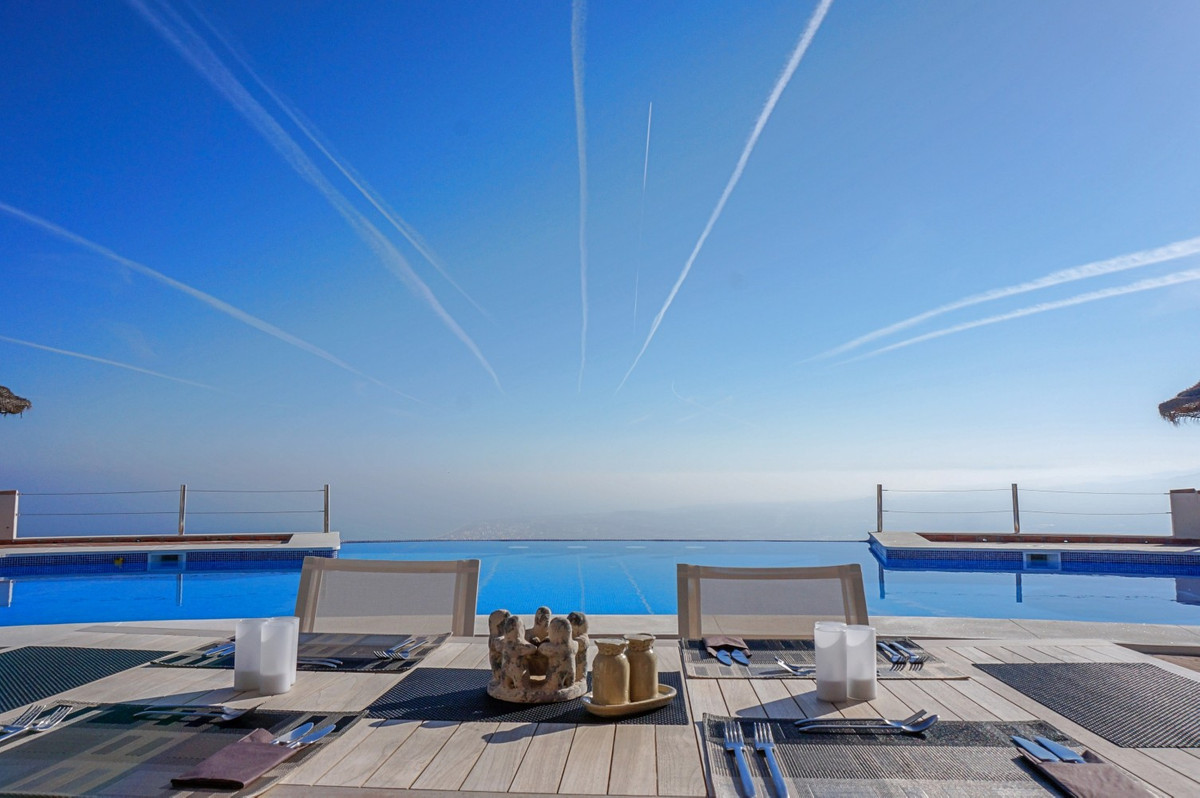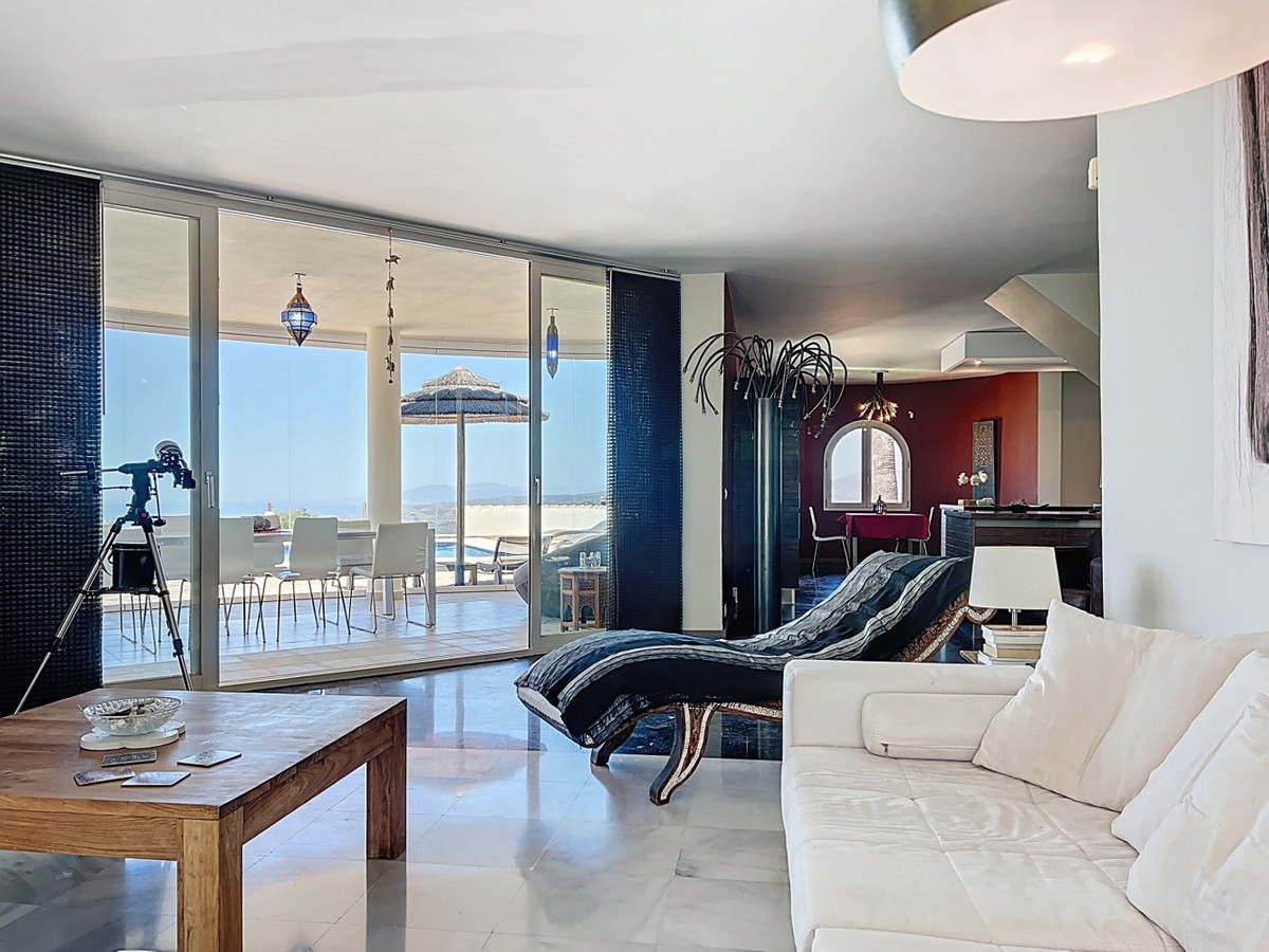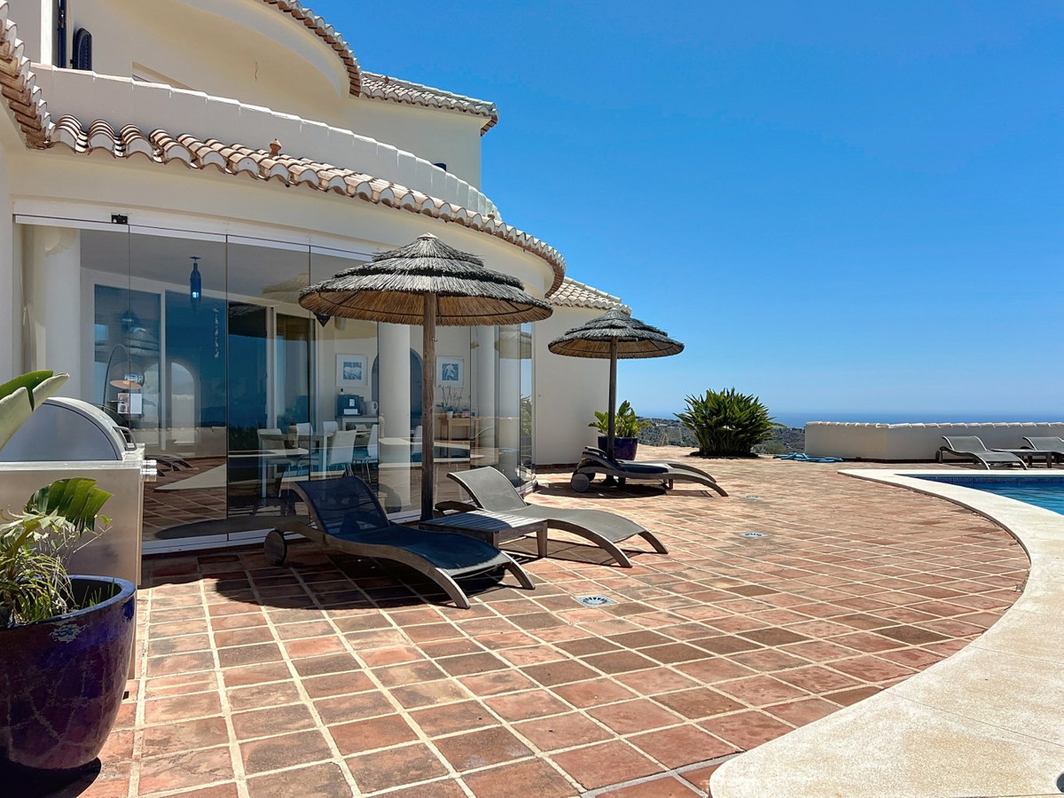 Imagine waking up each day to the soothing embrace of the Mediterranean in this exquisite villa. A true architectural masterpiece, this home offers an unparalleled lifestyle, seamlessly combining spacious interiors with awe-inspiring vistas that stretch all the way to the horizon. The living area welcomes you with an abundance of natural light, thanks to floor-to-ceiling sliding glass doors that perfectly frame the mesmerizing views of the azure sea. The open-plan design creates an ideal flow for both intimate gatherings and grand entertaining, blurring the lines between indoor luxury and outdoor paradise. For the culinary enthusiast, the gourmet kitchen is a dream come true, equipped with state-of-the-art appliances and ample space for creating memorable meals. Dine al fresco on the expansive terrace, where the gentle sea breeze enhances every moment. The lavish master suite, spanning 32.5 m2, offers a tranquil retreat with panoramic ocean views. Start your day in the spa-like bathroom, a true testament to luxury and comfort. The private balcony ideal for sipping morning coffee or enjoying an evening cocktail as you watch the sun dip into the sea.  At the outside, the terracotta-tiled outdoor terrace is your personal oasis. Bask in the warm Spanish sun, host unforgettable parties, or simply lose yourself in the mesmerizing views of the coastline. Beyond the beauty, this villa offers a rare opportunity for those looking to start a business, like a B&B. With 4 rentable rooms, each with its own bathroom and entrance, the property has already been successfully operated as a B&B, receiving only glowing reviews. In addition to the rental rooms, theres a private bedroom on the first floor with its own bathroom, and another bedroom with a bathroom in the basement. The fully equipped kitchen inside and the wonderful outdoor kitchen provide all the necessary amenities for running a successful business, while the large underground garage offers plenty of space for storage. Located in Algarrobo, Málaga, this property ensures easy access to world-class amenities, pristine beaches, and rich cultural experiences, all while offering the perfect setting to indulge in Mediterranean living. Whether you're looking for a luxury family home, a business opportunity, or simply a slice of paradise, this villa delivers on every front. This is more than just a home; its a lifestyle. Embrace the pinnacle of Mediterranean living in this extraordinary villayour dream of owning a piece of paradise is now within reach. Dont miss the chance to elevate your life to new heights of luxury, beauty, and opportunity. We are pleased to be able to present this dream property to you soon, either personally or via virtual viewing. Because this world, it is unique - just like our Axarquía. In Andalusia. On the Costa del Sol. Here, on the sunny side of life...