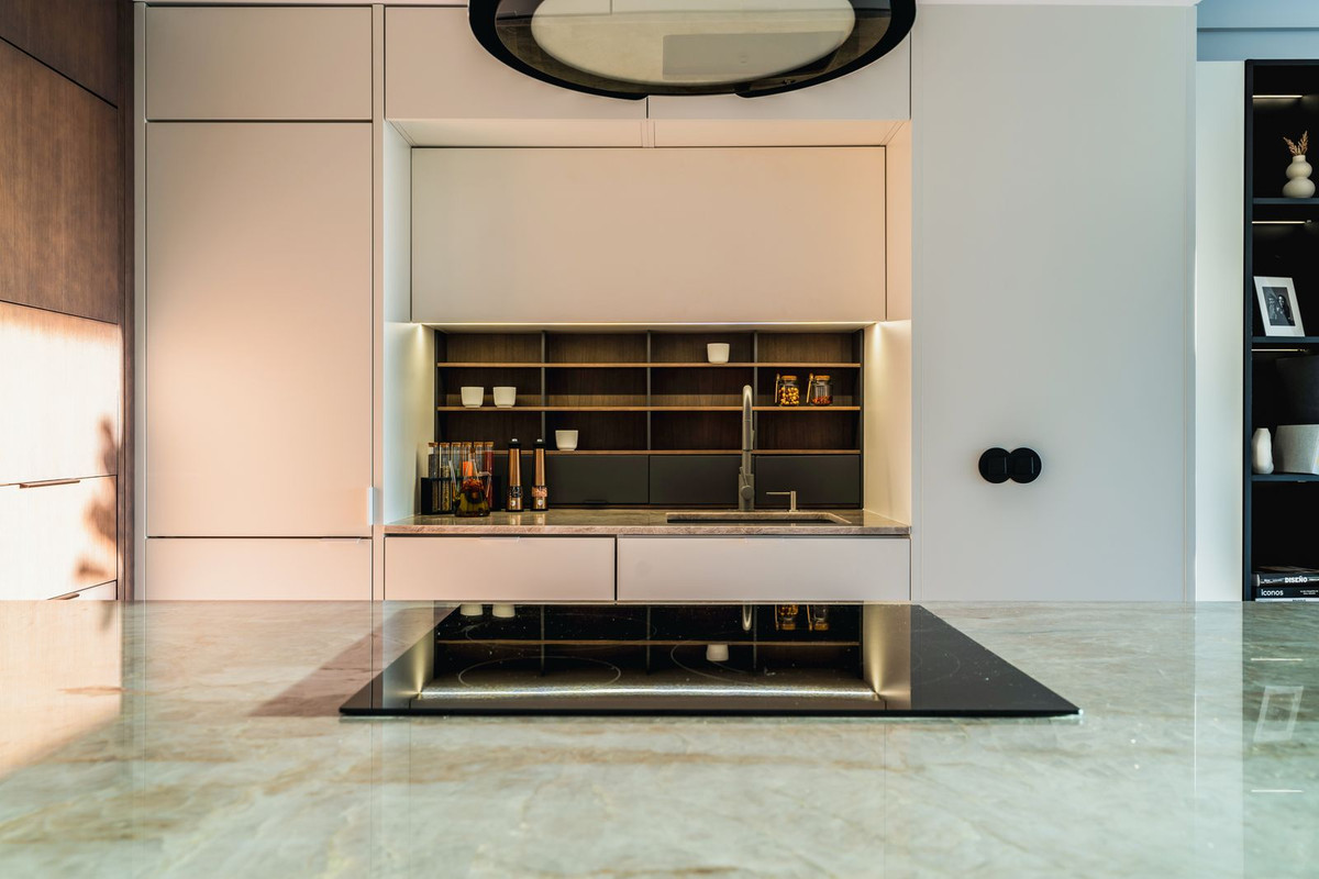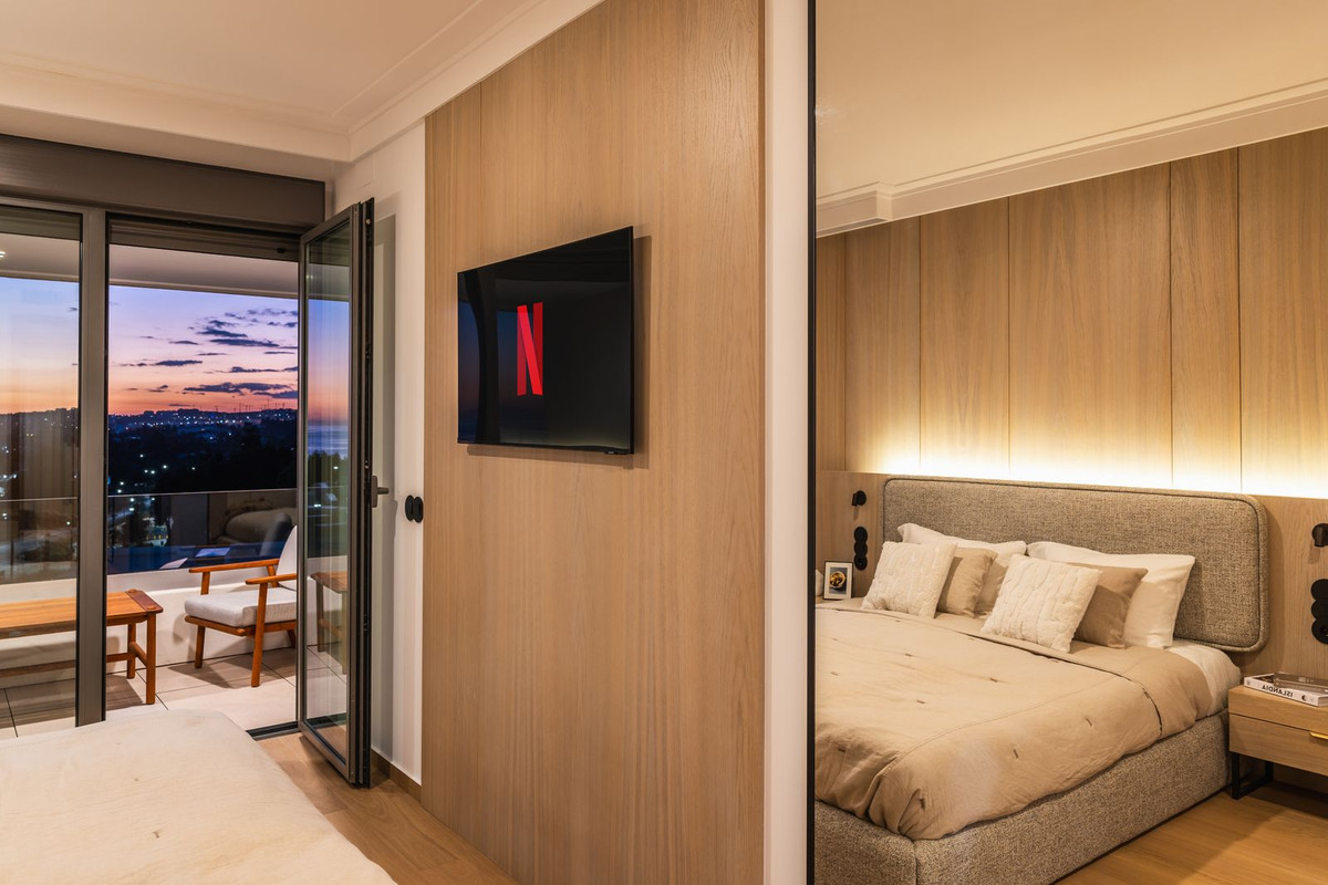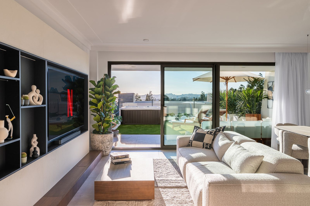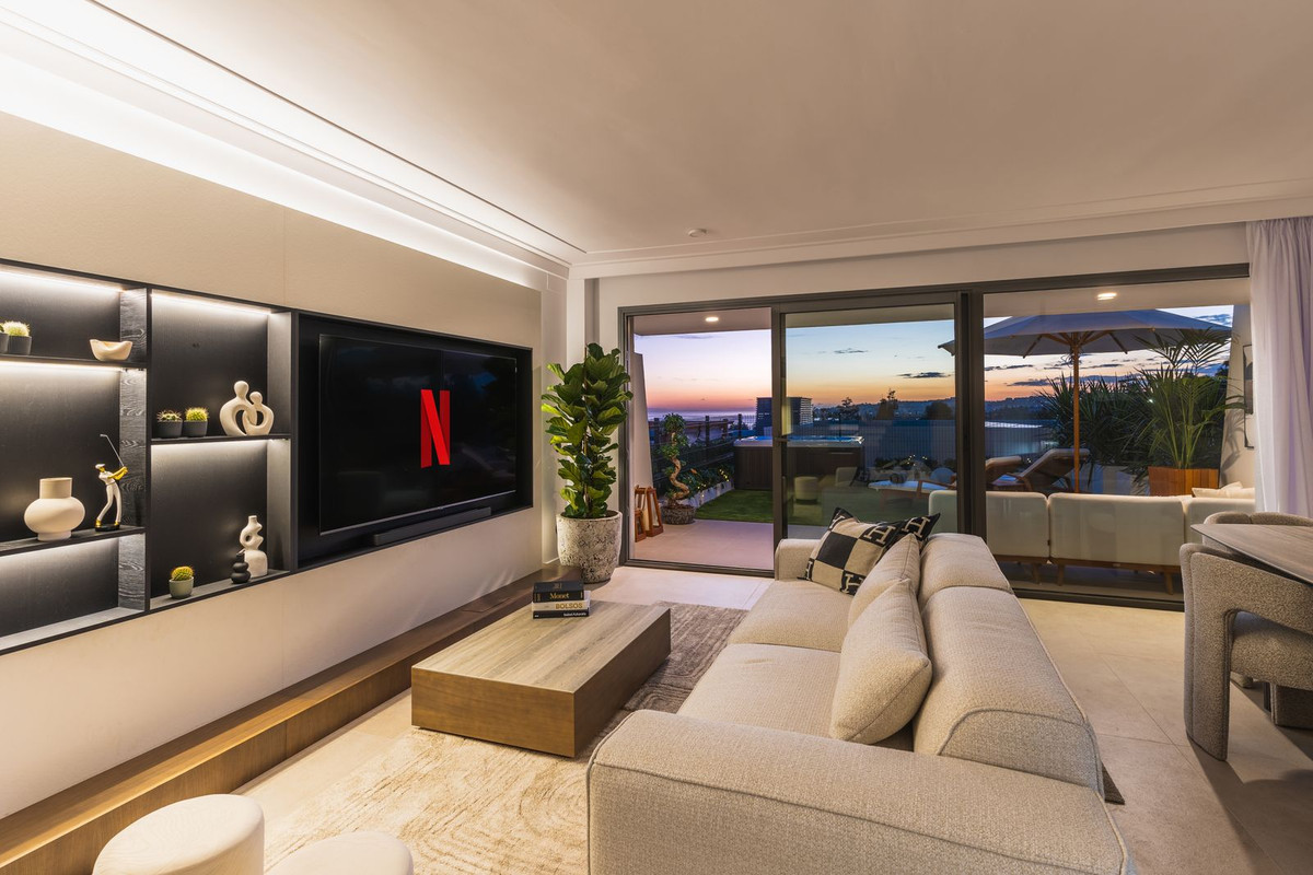 Ljusa, rymliga interiörer med stora, tredelade fönster som släpper in naturligt ljus och ramar in panoramavyer över Medelhavet. Öppen planlösning med toppmodern, skräddarsydd köksinredning och vardagsrum som öppnar mot en stor terrass med privat jacuzzi – ett perfekt ställe att njuta av havsutsikten.