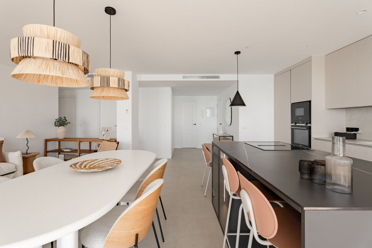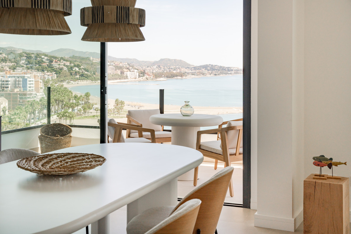 Fastigheten har totalrenoverats med exceptionella kvalitetsmål och en raffinerad modern design. Det omfattar en rymlig öppen planlösning levande och matplats, förstärkt av expansiva golv till tak fönster som översvämmar utrymmet med naturligt ljus. Det fullt utrustade köket är sömlöst integrerat i detta område, vilket skapar en ljus och inbjudande social nav. Detta öppna utrymme strömmar ut på en fantastisk terrass med utsikt över Medelhavet och La Malagueta stranden.