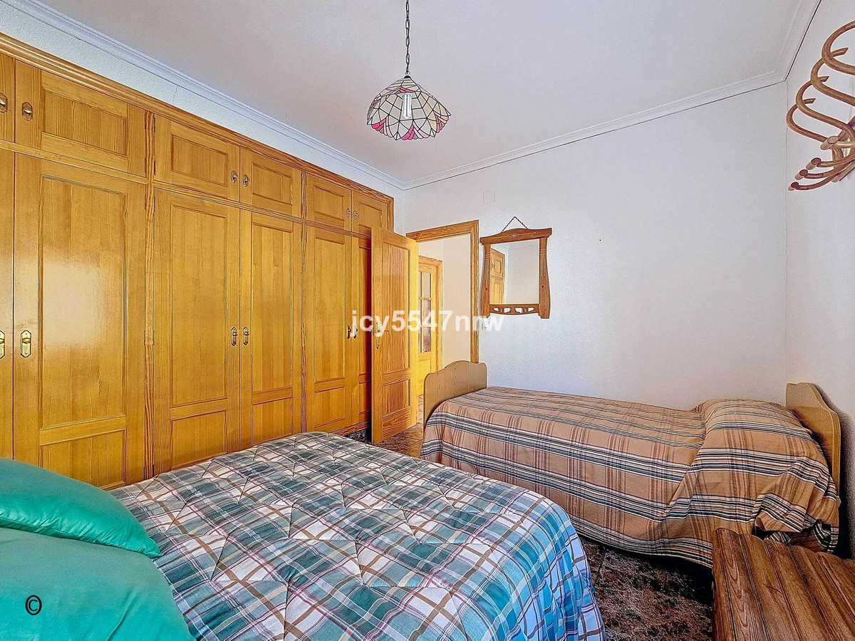 Upon entering the property, two bedrooms are located on either side of the hallway. One of the bedrooms has a large built-in wardrobe. Double doors lead to the spacious living room, which gives access to the third bedroom with an adjacent bathroom. From the living room, there is also access to a second living room or dining room; a cozy space with a fireplace and air conditioning (hot/cold), which leads to the spacious kitchen and large patio.