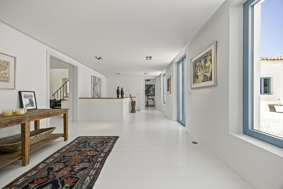 With nearly 700m2 of south-facing interior space, the home is thoughtfully designed for relaxed living and entertaining. Five en-suite bedrooms, expandable to six, are complemented by bright open-plan living areas, a home cinema, and a games room. Outdoor spaces feature a poolside bar, barbecue area, and expansive terraces for year-round enjoyment. The architecture reflects classic andalusian style, with a romantic central patio, whitewashed walls, blue shutters, and a layout that balances family comfort with refined hosting areas.
