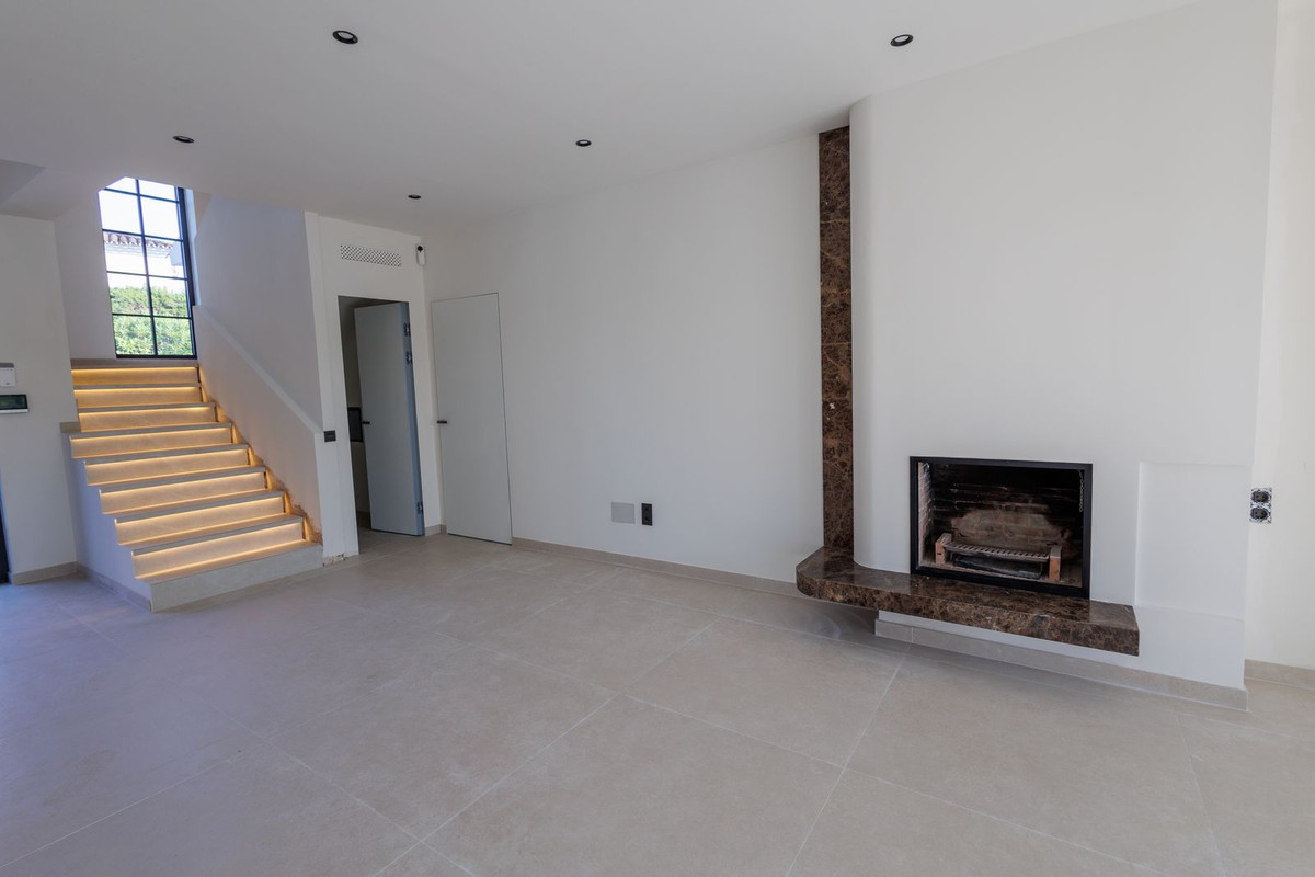 • En öppen spis med marmorklädsel ger vardagsrummet både värme och elegans.