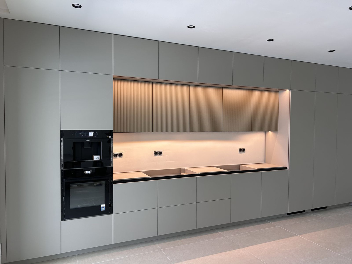 Det moderna köket, designat enligt de senaste trenderna, är utrustat med en inbyggd kyl och frys med dubbeldörrar, ett vinskåp samt en spishäll med integrerad köksfläkt, vilket gör det både stilrent och funktionellt.