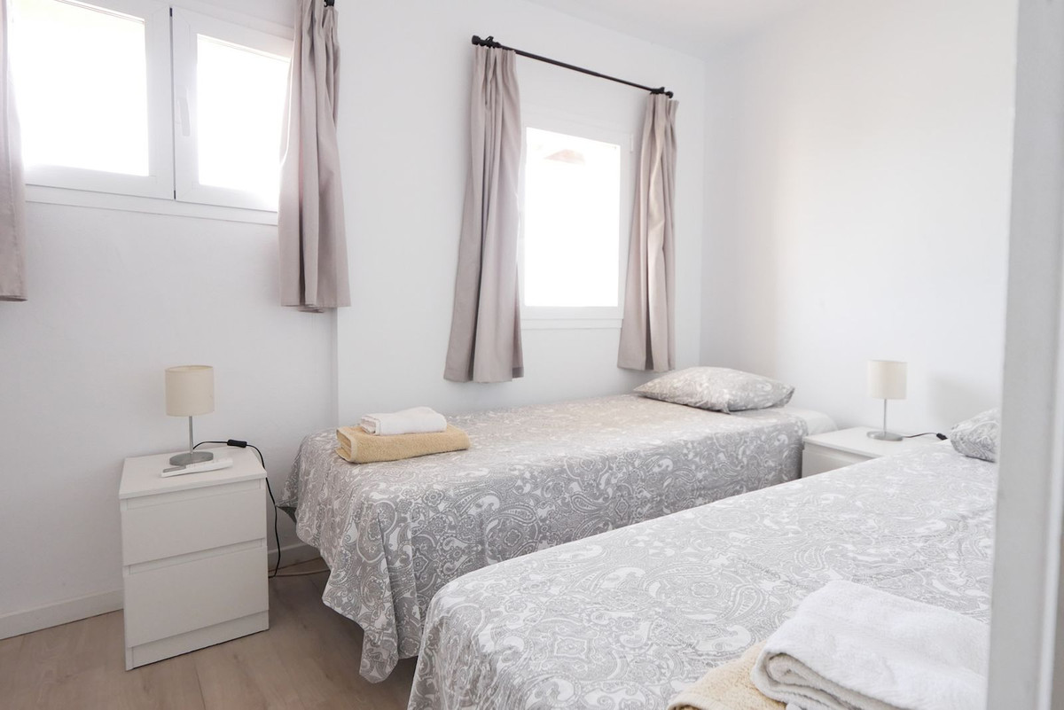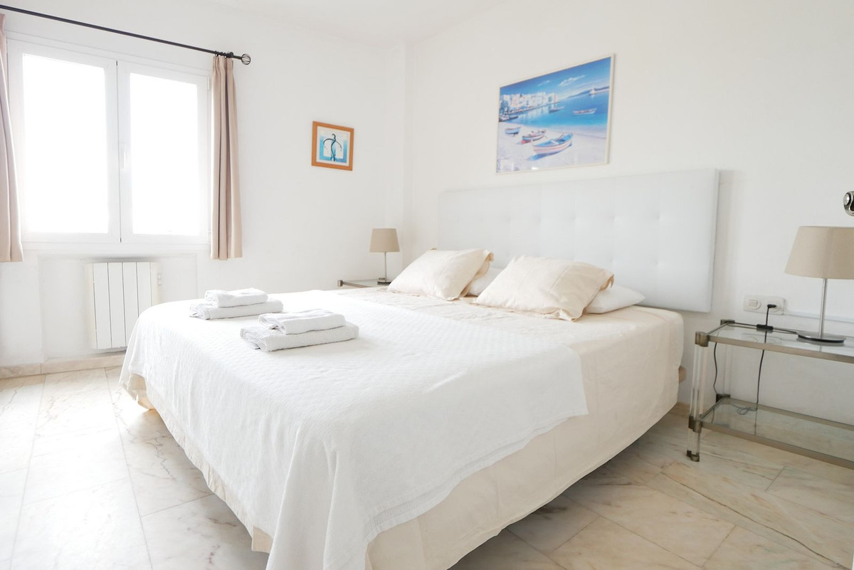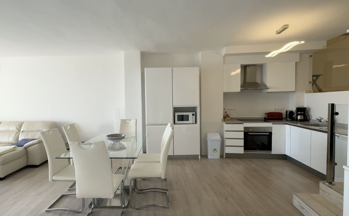 An entrance hall with a spacious bedroom on the first level, a full bathroom with another bedroom with sea views, and then a kitchenette in a comfortable and spacious open-plan living and dining area with direct access to the terrace.