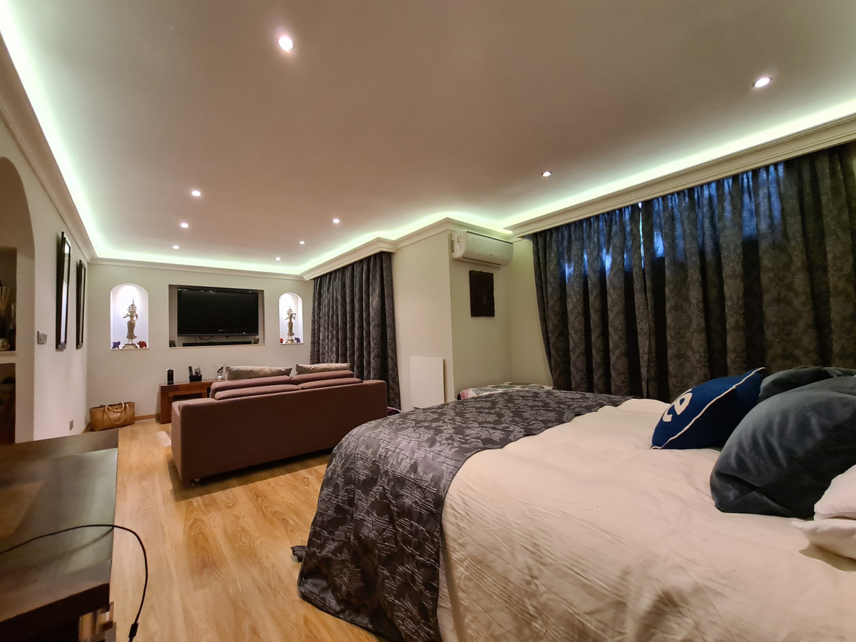 The primary suite is a true retreat, offering a five-star ambiance with its expansive bedroom, private lounge, opulent en-suite bathroom, and walk-in wardrobe. A fourth bedroom upstairs, currently styled as a home office, adds further flexibility.