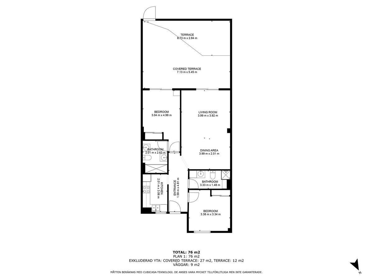 Lägenheten har en stor terrass med täckta ytor som är perfekta för grillkvällar och mat utomhus samt öppna solområden som är idealiska för solstolar och avkoppling i solen. Inomhus finns en rymlig entré som leder till ett ljust och luftigt vardagsrum med direkt tillgång till terrassen. Det oberoende fullt utrustade köket kompletteras av två badrum och två sovrum varav ett har eget badrum och inbyggda garderober.