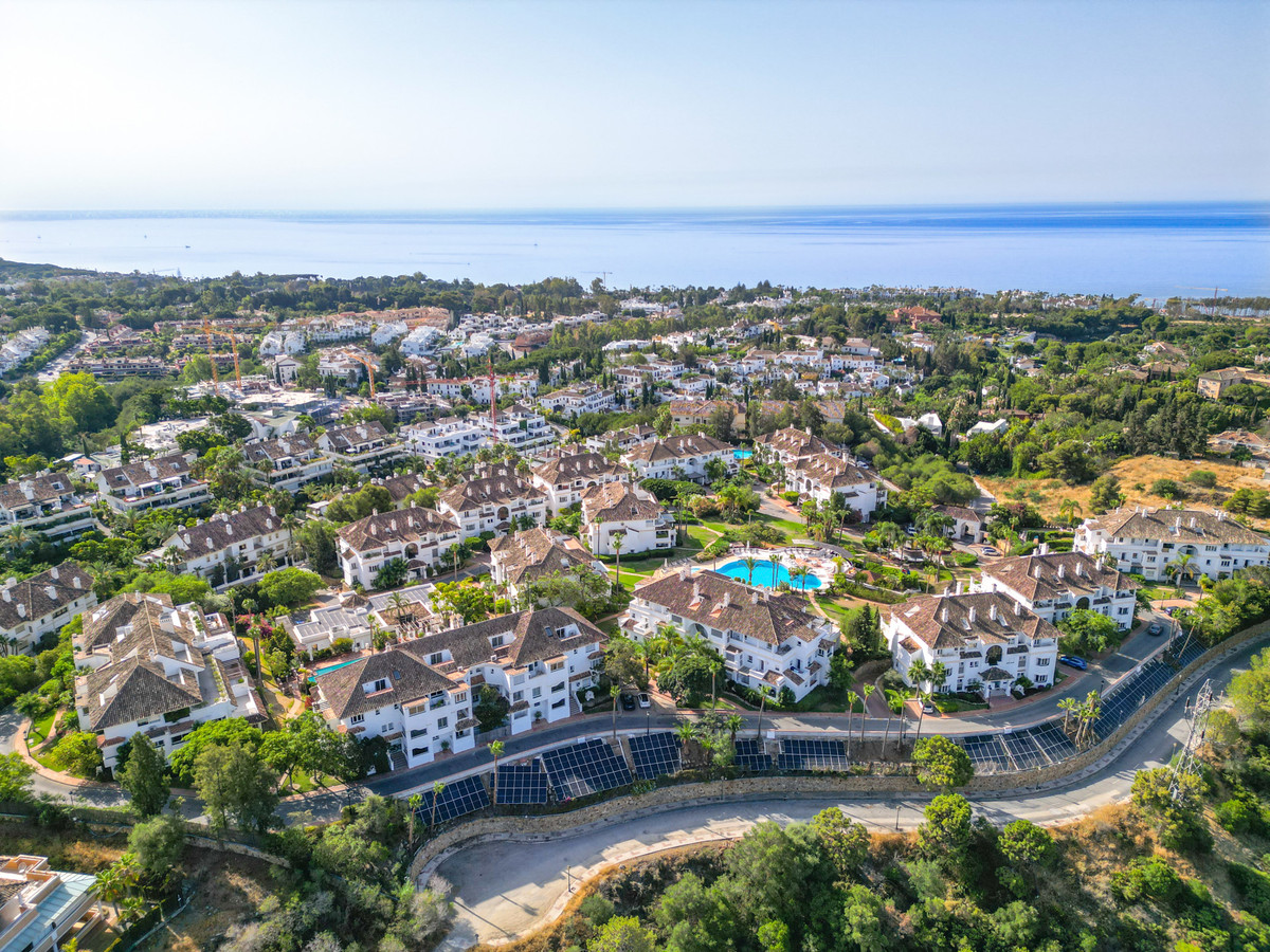 Underbart tre sovrum, sydöstra inför duplex takvåning i den exklusiva och gated community av Monte Paraiso på Golden Mile, med 24hr säkerhet, flera utomhuspooler, en bar / restaurang, barns lekområde, fullt utrustade gym, ångrum, bastu, squash domstol, massagerum, inomhus uppvärmd pool och tropiska trädgårdar som underhålls till högsta standarder. Förutom allt detta är det bara en kort promenad till det berömda Puente Romano Hotel och stranden. Huvudnivån på fastigheten har en stor levande och matplats med uteplatsdörrar som leder ut till den rymliga terrassen med fantastisk havsutsikt; ett fullt utrustat kök med separata verktygsrum; två gäst sovrum, en med en privat terrass med fantastisk utsikt över La Concha berg; och ett gäst badrum. Den övre nivån leder till mastersviten med valvtak, ett jacuzzibad och tillgång till en privat terrass med spektakulär havsutsikt. Andra funktioner inkluderar marmorgolv, eldstad, monterade garderober, varm och kall luftkonditionering, två privata parkeringsplatser och ett förvaringsrum.
