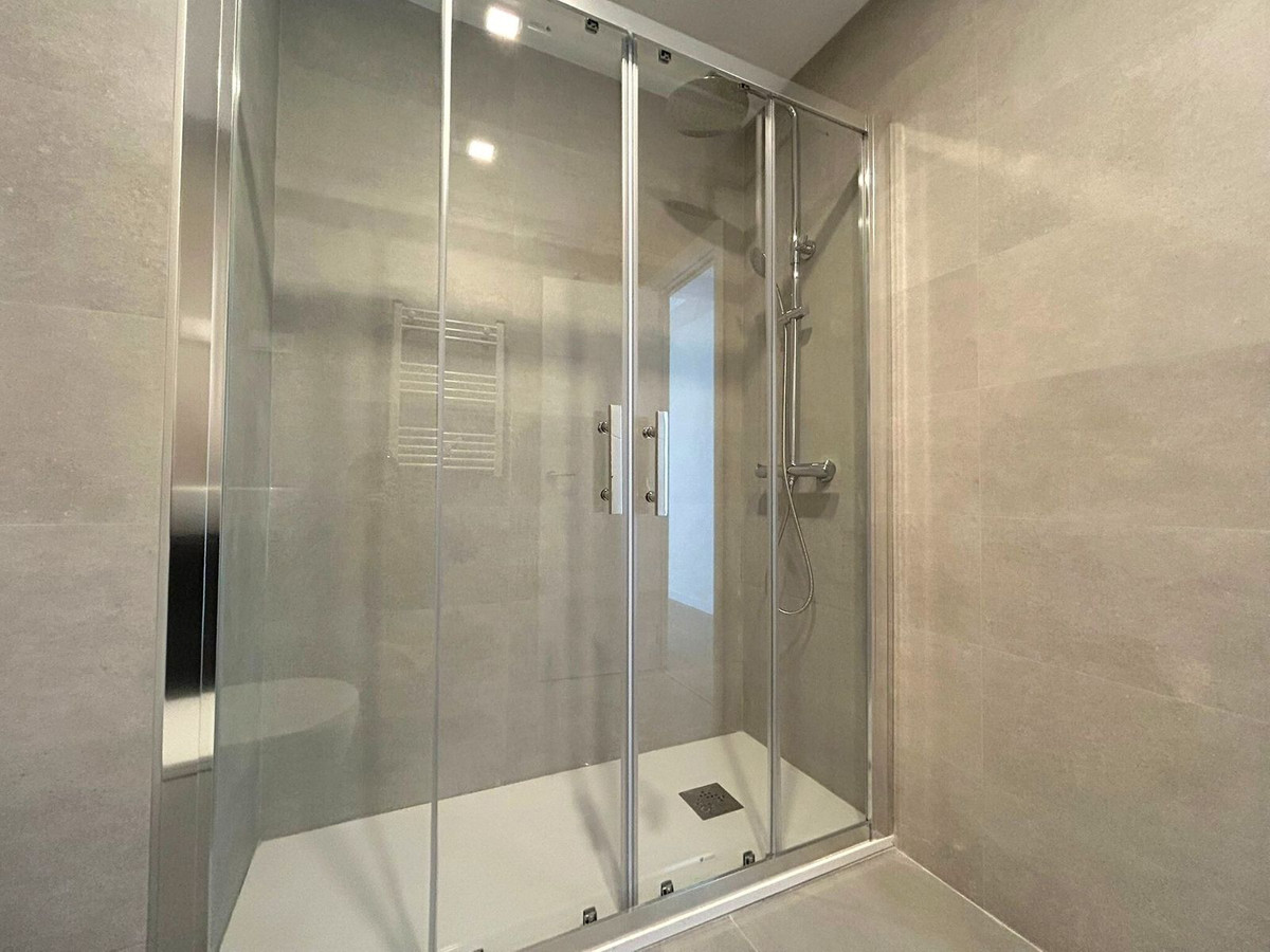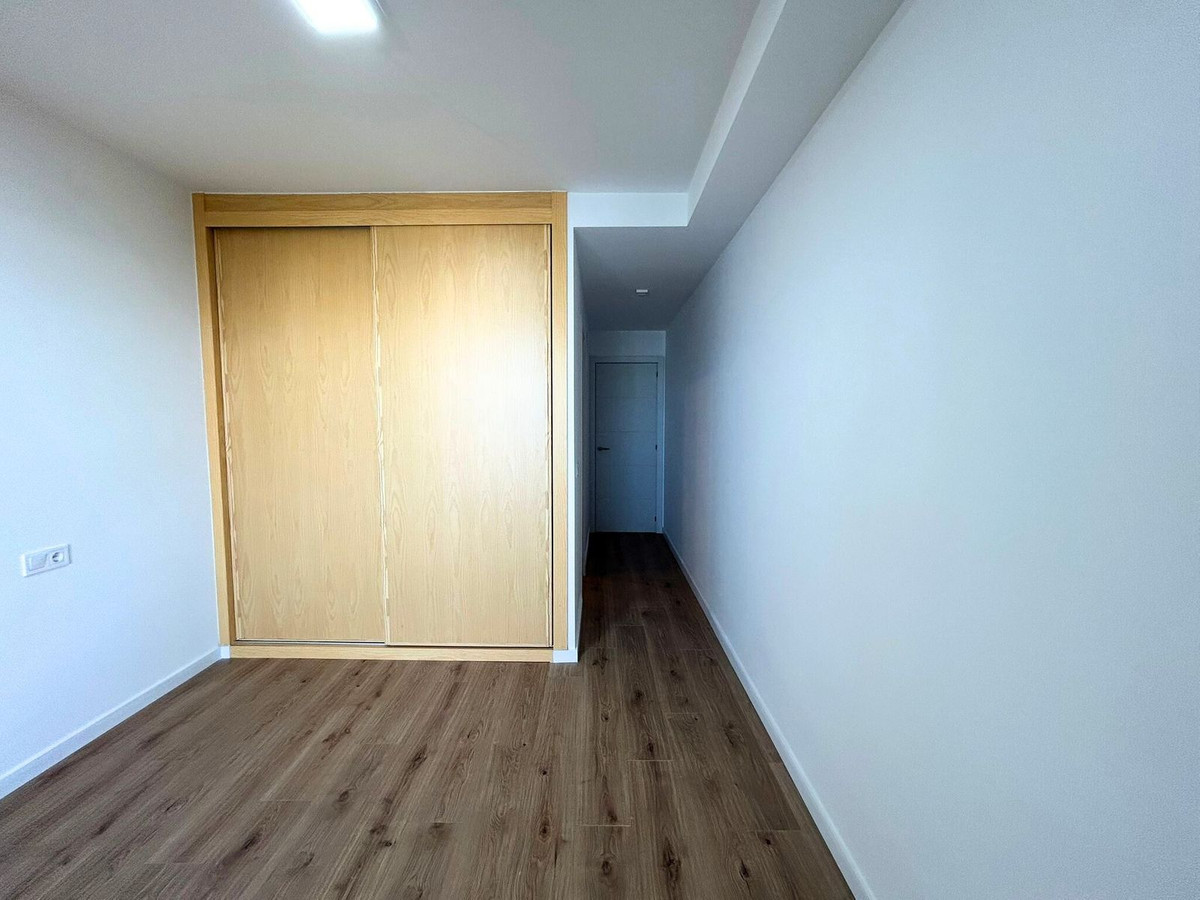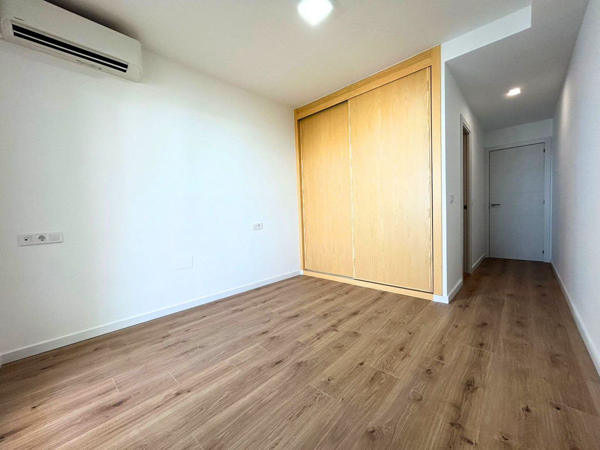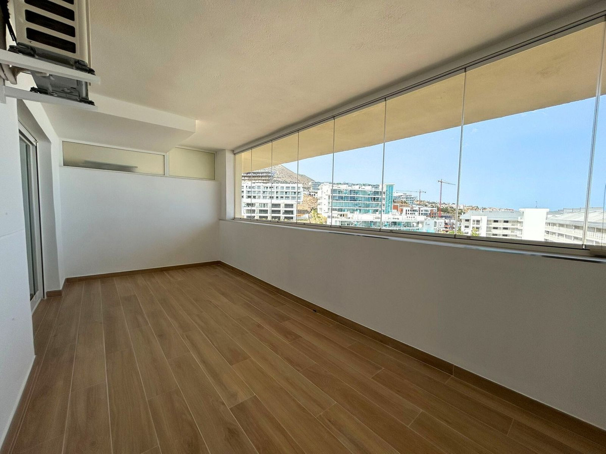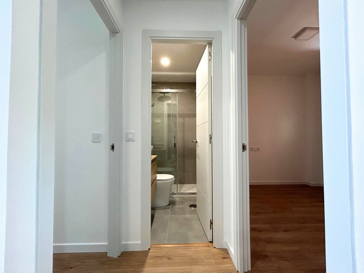 Bostaden har en funktionell och modern planlösning med två sovrum och två badrum. Ett av sovrummen har ett eget badrum med badkar, medan det andra badrummet har en praktisk dusch. Det ljusa och inbjudande vardagsrummet/matsalen har direkt tillgång till balkongen, som även är kopplad till fönstret i sovrummet med eget badrum, så att du kan njuta av den friska havsluften.