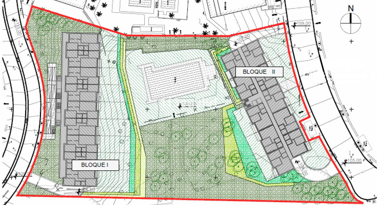 Land in Riviera del Sol with the possibility of developing 64 apartments with 2 and 3 bedrooms, each one with its own storage room and parking space. Buildable area of 7.080 m2 for residential use, compatible with hotel use. Construction license granted in 2012 and expired. Preliminary project for two residential blocks with 7.017 m2 built above ground.