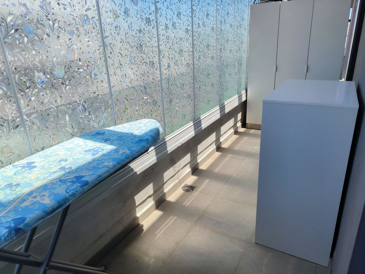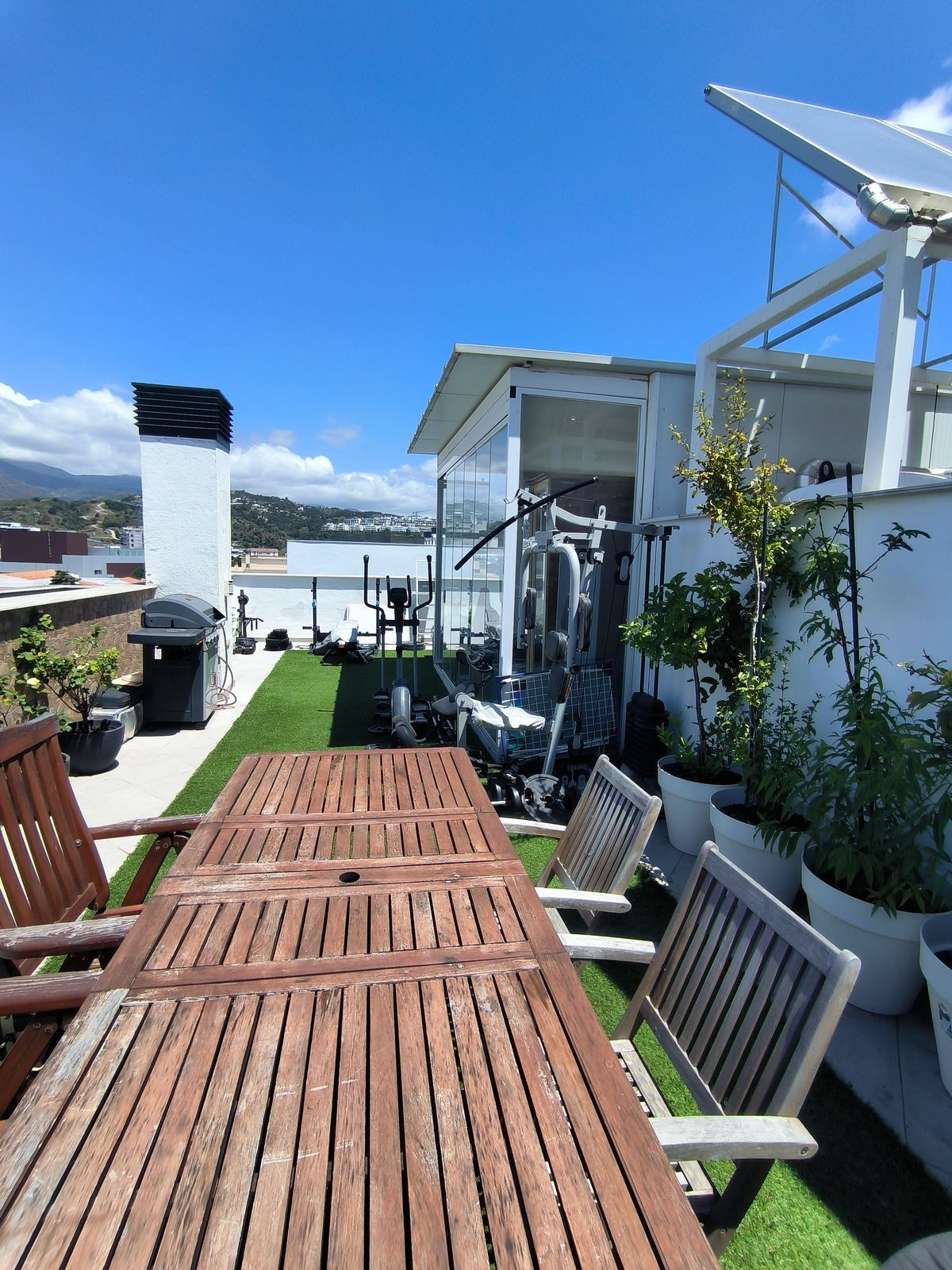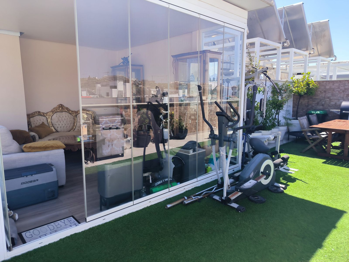 However, the true highlight of this home lies above: an impressive 63 m² private rooftop solarium with panoramic views over the entire city and stretching out to the majestic Sierra Bermeja mountains. This outdoor space invites you to embrace al fresco living—whether it's sharing meals under the open sky, relaxing in the barbecue area, or even cultivating your own urban garden. There is also a glazed room on the rooftop, ideal as a reading nook, study, or relaxation space.