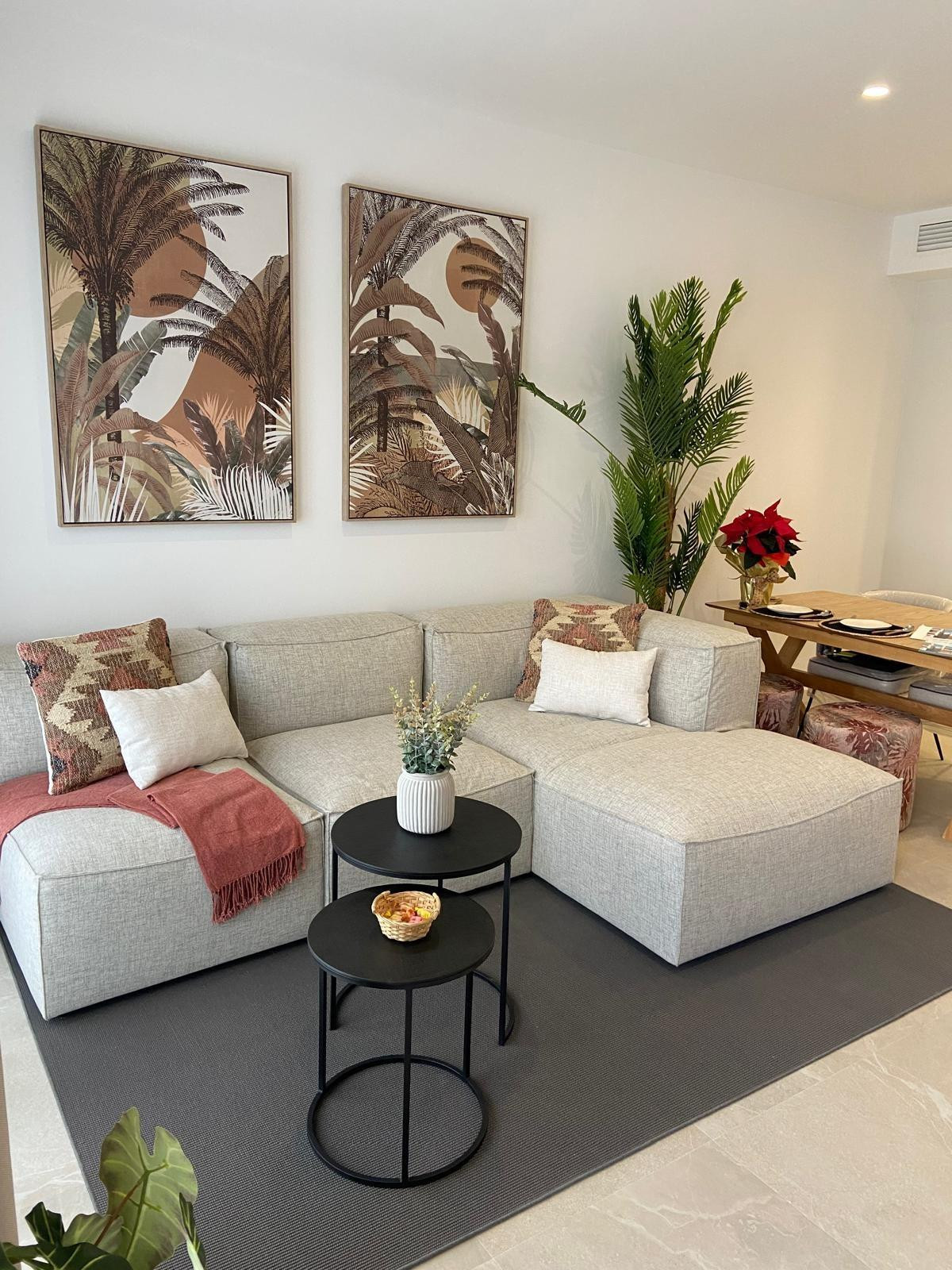 The main door opens onto a spacious and bright living room, where natural light enters through the large windows that connect with the exterior. The layout is designed for comfort: next to the living room there is a cosy bedroom and a complete bathroom that includes a practical laundry room, providing functionality without sacrificing style.