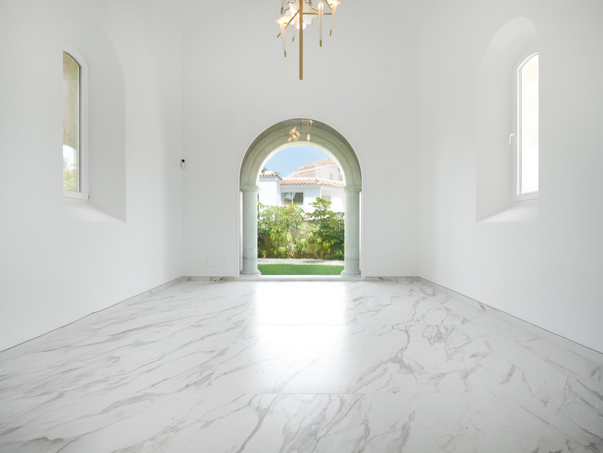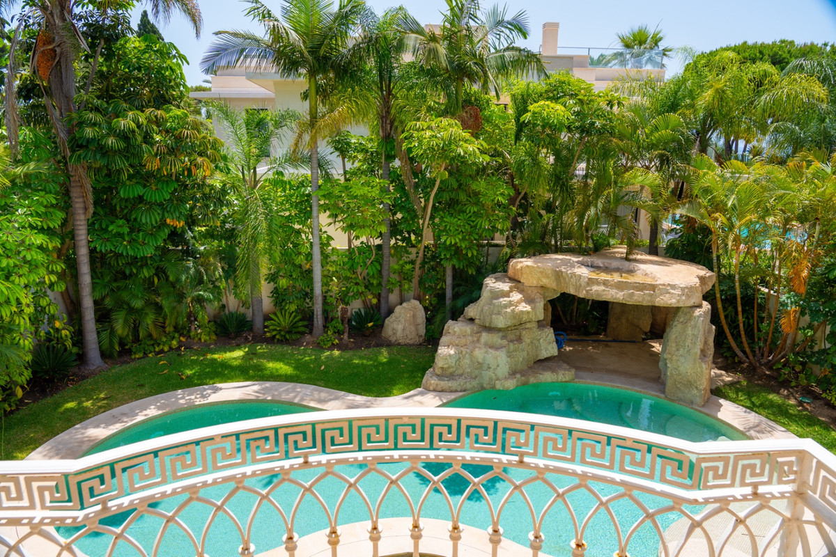 Outside, Villa Roma offers a private haven surrounded by tall palm trees. The pool, with its four waterfalls, creates a peaceful, spa-like atmosphere, while a stone terrace with a wood-burning barbecue makes entertaining easy. A fishlake beside the terrace adds to the villa's charm and serenity. Every detail of Villa Roma has been designed with care, making it a rare opportunity to own a truly timeless property just moments from Marbella's finest beaches.