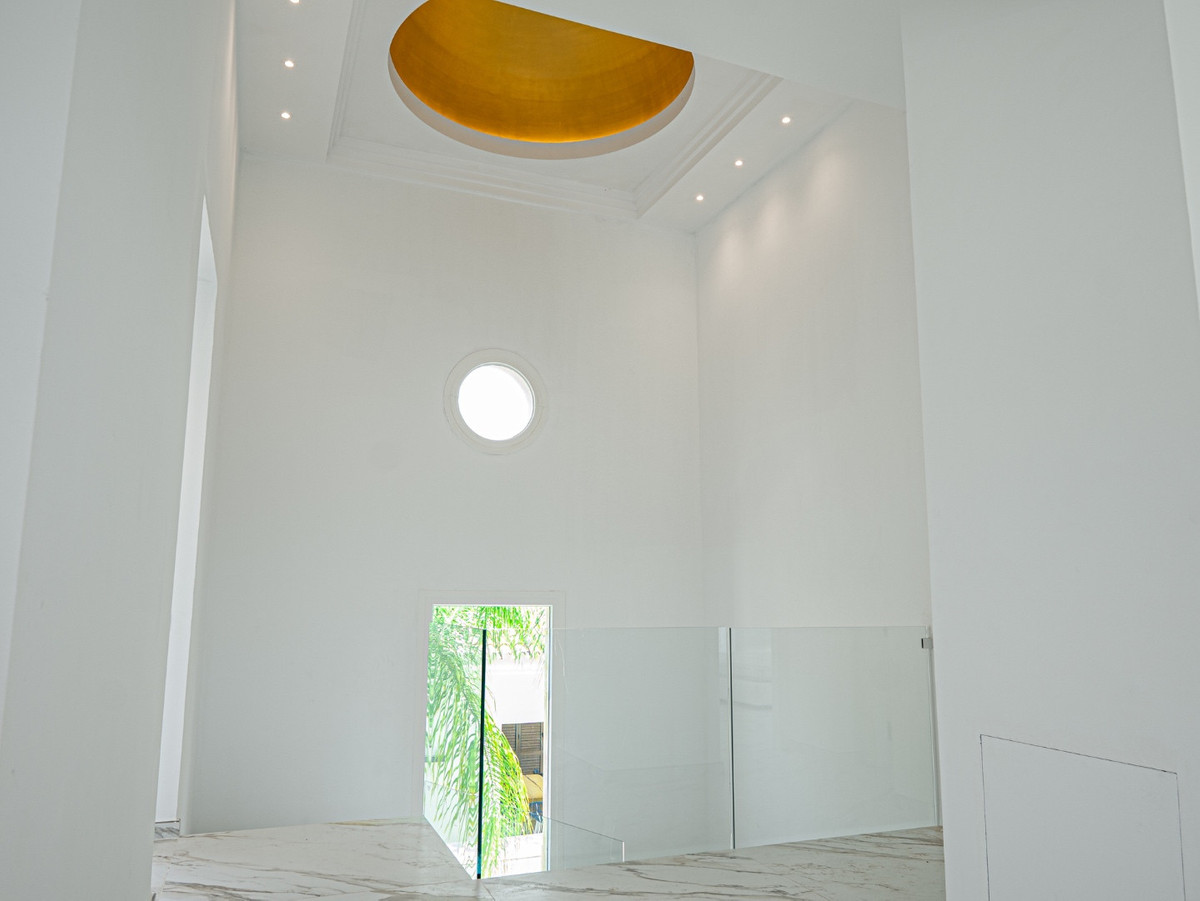 Step inside through a grand entrance with elegant pillars and marble floors that set the tone for this exceptional home. The open-plan living room features a grand fireplace, while the upper level enjoys natural light from a domed ceiling and large windows. The master suite includes a walk-in dressing room, a Juliet balcony overlooking the pool, and a sense of calm and privacy. The lower level adds flexibility with space for a gym, cinema, or guest suite—ideal for modern living.