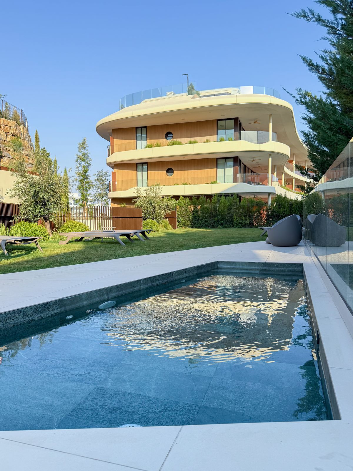 Egenskaper : Täckt terrass, Hiss, Inbyggda garderober, Privat terrass, Takterass, WiFi, Gym, Bastu, Padel Tennis, Tennisbana, Förrråd, Tvättstuga, Handikappanpassat, Dubbelglas, Nära restaurang, Fiber.