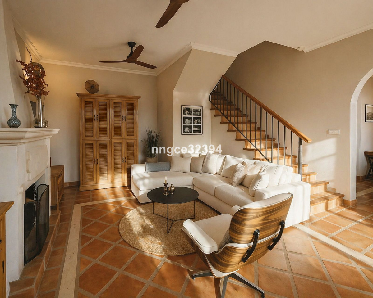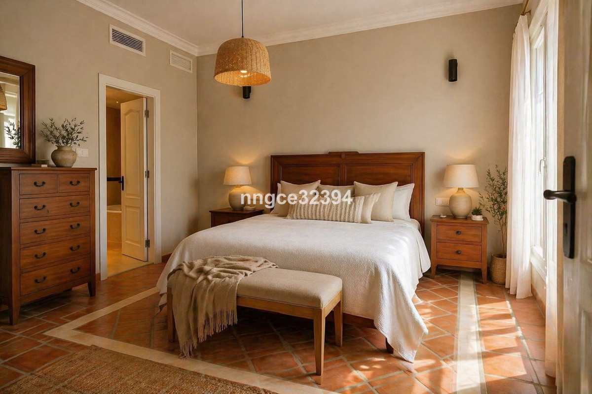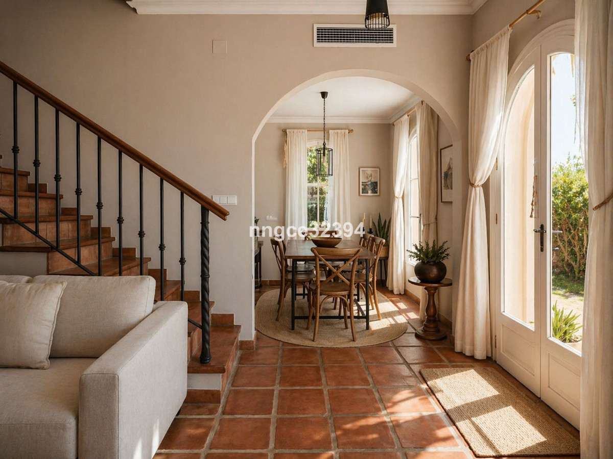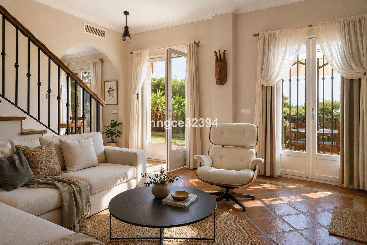 Inuti denna säkra, bevakade bostadsförening finner du en unik öppen planlösning med varma Saltillo-klinkergolv med marmorinläggningar. Ett solbelyst vardagsrum med tre franska dörrar öppnar sig smidigt mot terrasserna, trädgårdarna och din privata pool. Det rymliga täckta garaget erbjuder plats för flera bilar, en båt eller till och med en husbil — en sällsynthet i området.