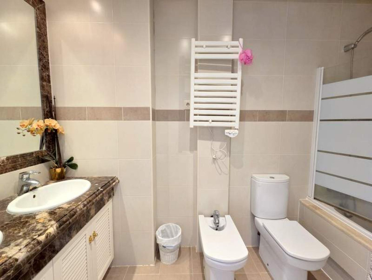 ***Elegant Boutique Community Living*** Ibergolf is an exclusive and intimate residential enclave nestled within the serene surroundings of Azata Golf, Estepona. This beautifully appointed property offers exceptional accommodation throughout and is the perfect blend of sophistication, comfort, and Andalusian charm. From the moment you enter, you're greeted by stylish interiors featuring marble flooring, ornate staircases, and elegant decorative finishes that exude timeless quality. The gated community is impeccably maintained, with landscaped gardens, meandering pathways, and a sparkling communal pool – ideal for relaxing or entertaining. The entrance hall opens to a fully equipped kitchen and dining area, enjoying delightful views over the front gardens. A guest bathroom is conveniently located along the hallway, alongside internal access to the private garage and basement storage. The living area is warm and inviting, with a feature fireplace and oversized patio doors leading out to a spacious terrace – the perfect spot to enjoy breathtaking views of the sea and golf course. Upstairs, you'll find three generously sized bedrooms, all with ample wardrobe space. The main bedroom features a luxurious en-suite bathroom and a Juliette balcony, while the second and third bedrooms both enjoy charming balconettes and share a stylish family bathroom. Offered fully furnished, this property includes a private garage and additional storage area, accessible both internally and externally – making it as practical as it is beautiful. The property also has a tourist licence for those looking to achieve a rental yield.