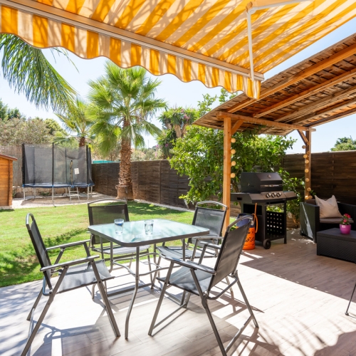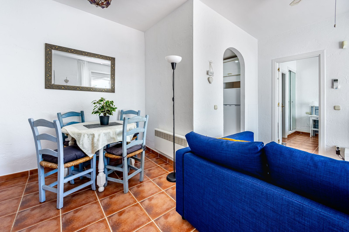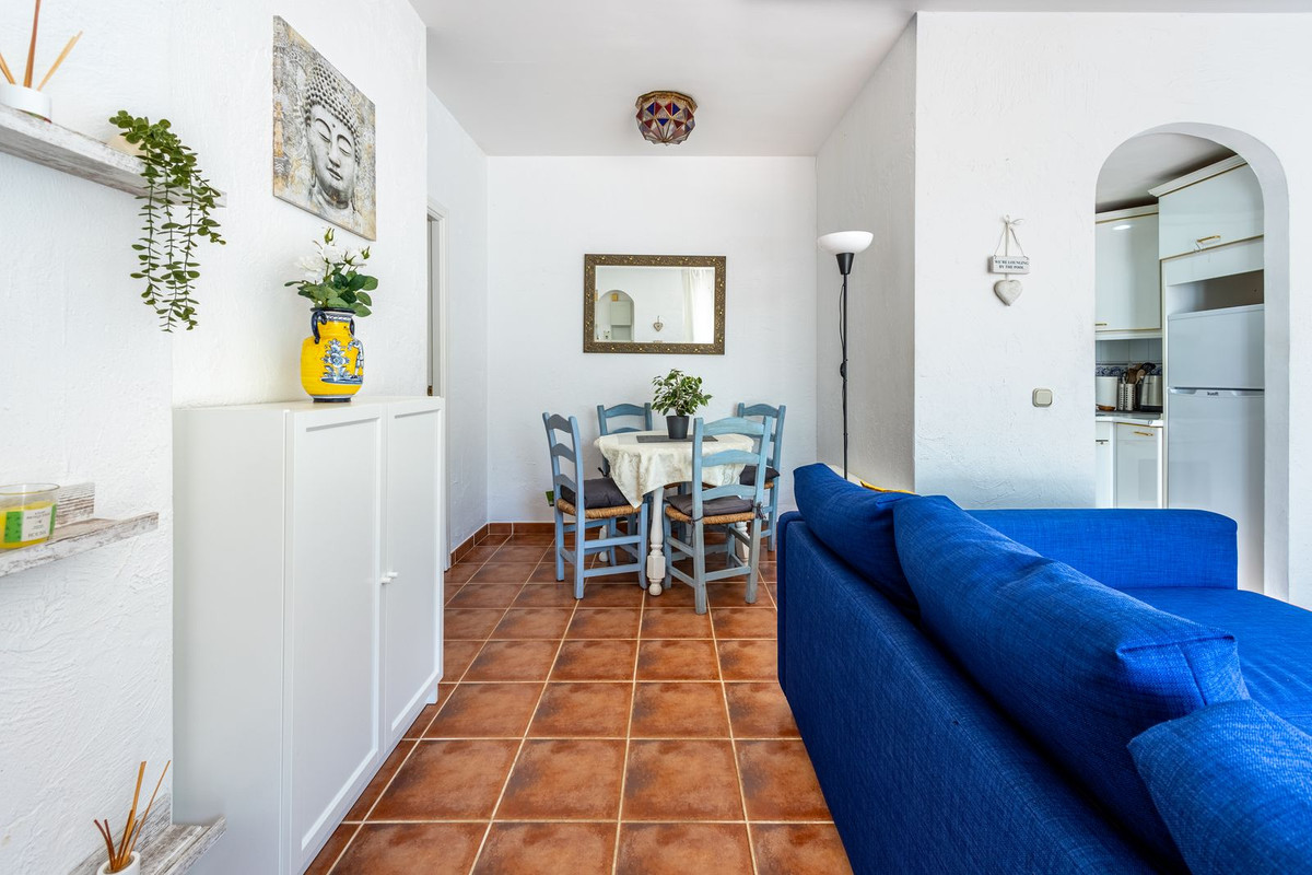 The open-plan living and dining area retains a warm, inviting atmosphere, enhanced by traditional finishes and natural light. The living room leads on to a small terrace, with enough space for a small table and chairs to enjoy the evening breeze.