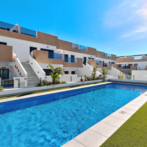Hus med 2/3 sovrum, 2/3 badrum och stora privata utomhusområden, parkeringsplats för varje hus och gemensam pool.