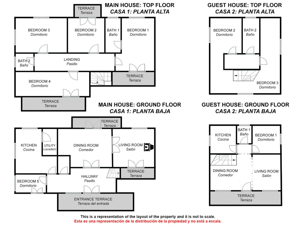 • Ground floor: beautiful entrance hall, large living room with fireplace, and access to a front terrace with views. The dining room also connects to a pleasant rear terrace with direct access to the pool and gardens. This floor also includes an independent kitchen, a full bathroom, and one bedroom.