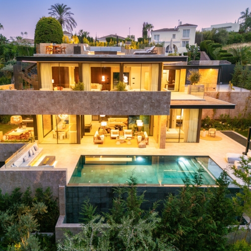 Vi är glada att kunna presentera en fantastisk modern villa i hjärtat av Nueva Andalucía, i ett exklusivt och inhägnat område som är känt för att ha ett av de bästa säkerhetssystemen i Marbella – här bor du både tryggt och privat. Huset imponerar med sin snygga, moderna design, rena linjer och naturliga material i mjuka färger.