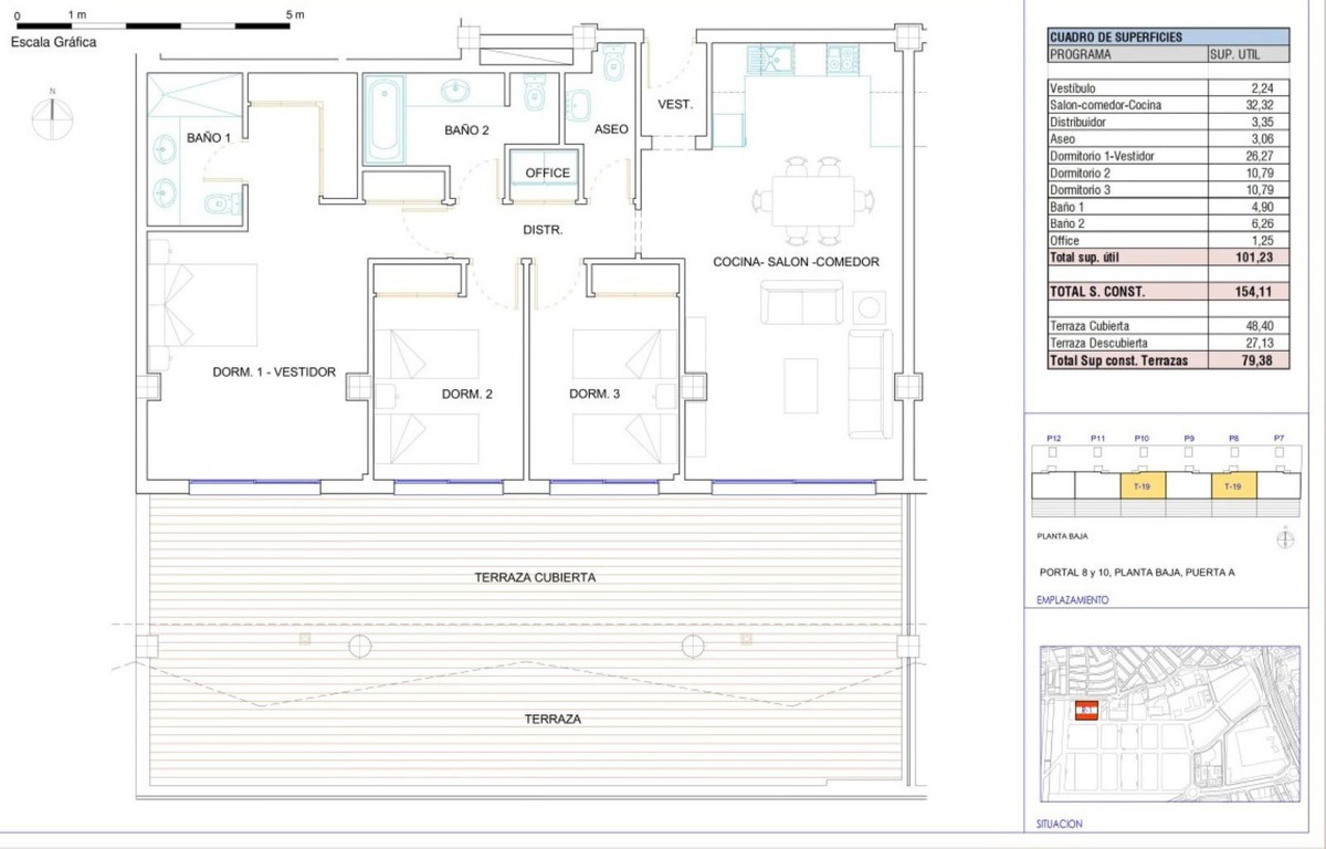 Lägenheten har 3 sovrum, varav ett är master bedroom och har eget badrum. Från alla sovrum når man terrassen som har en fin utsikt över parken. Köket är öppet mot vardagsrummet och här har man även direkt tillgång till terrassen.