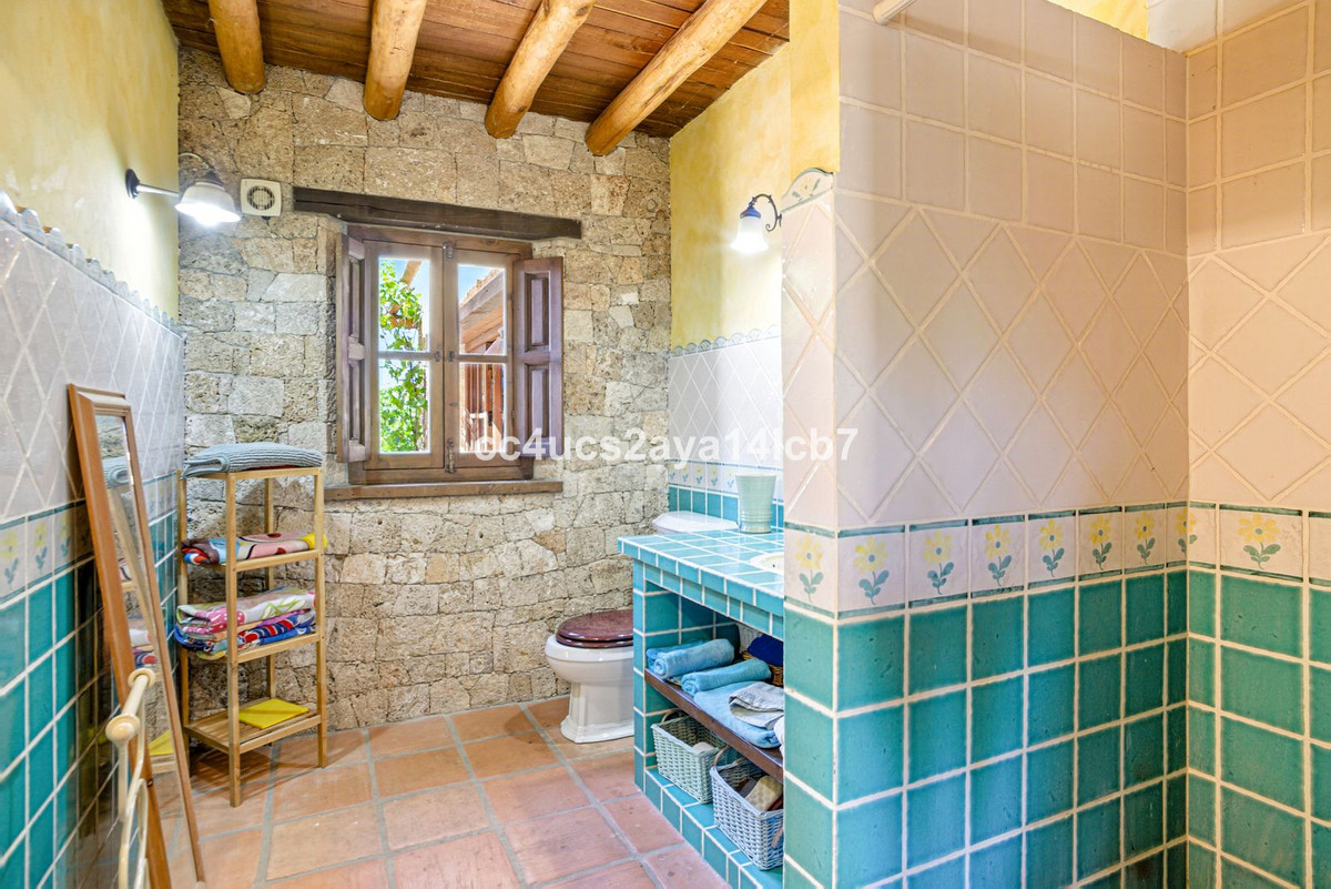 Adjacent to the main house is a charming guest cottage or casita, built with authentic Spanish limestone. This beautiful space includes two bedrooms, one bathroom, and a fully fitted kitchen complete with a pizza oven. The flooring is a distinctive feature, sourced from the original Guinness factory.