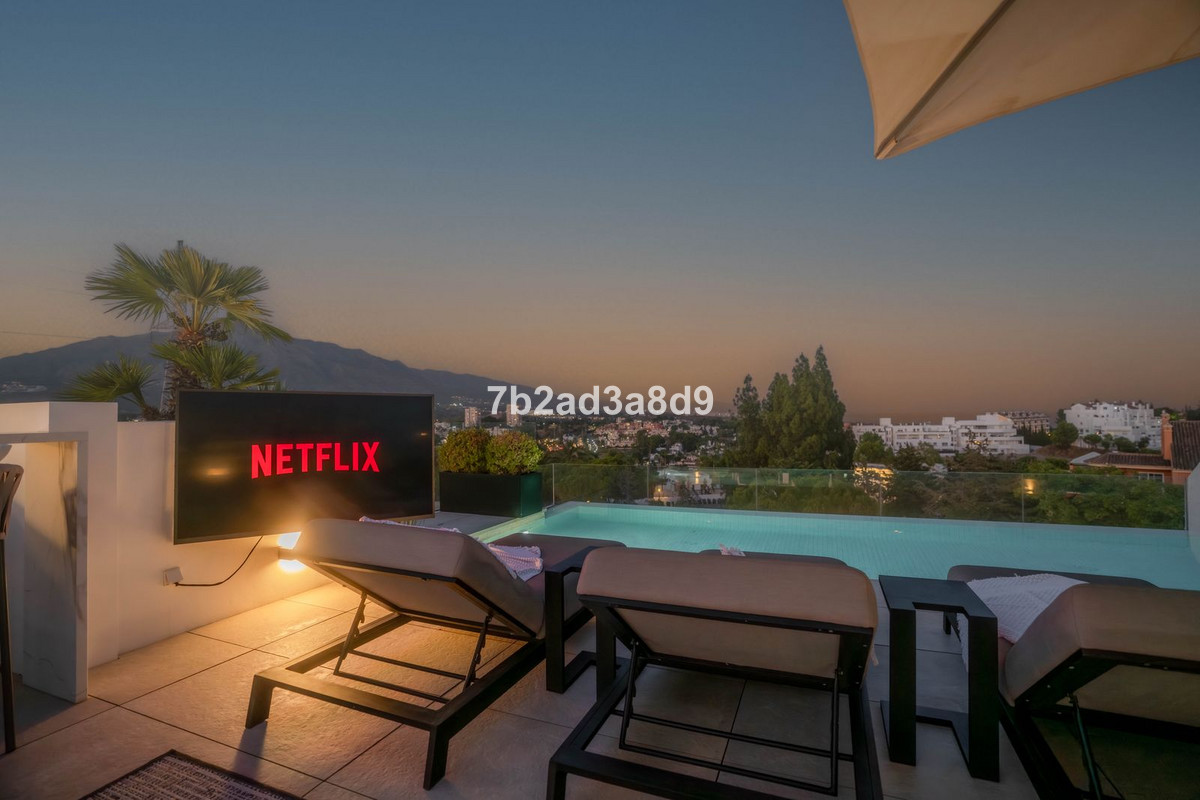 Utformad för att smidigt förena inomhus- och utomhusliv, erbjuder villan en rymlig täckt terrass – perfekt för middagar och avkoppling med familj och vänner. Det specialdesignade taksolariet med privat plunge pool erbjuder vidsträckt panoramautsikt över Golf Valley och det ikoniska La Concha-berget.