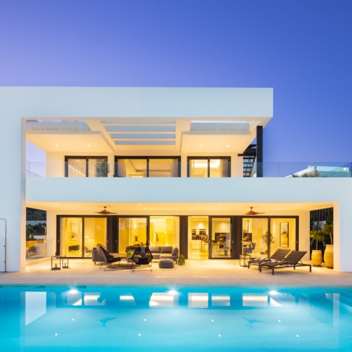 Vi är stolta över att presentera en exceptionell, modern villa belägen i hjärtat av Nueva Andalucía, inom ett exklusivt, inhägnat bostadsområde som är känt för att ha ett av de mest avancerade säkerhetssystemen i området, vilket garanterar en verkligt privat och trygg boendemiljö. Detta arkitektoniska mästerverk imponerar med sin djärva geometriska design och en raffinerad palett av naturliga material i lugna, neutrala toner.
