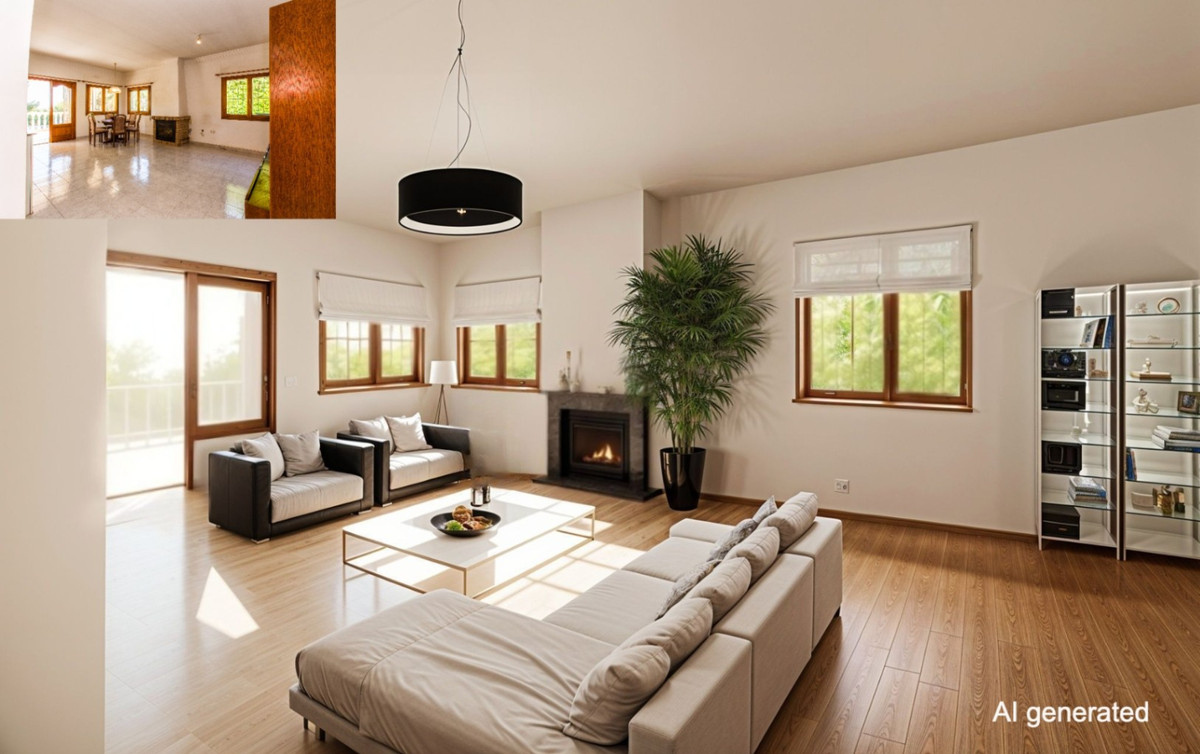 The heart of the house is the bright living-dining room with gas fireplace. The adjoining open kitchen is functionally designed and provides direct access to the terrace. A few steps lead from the terrace to the swimming pool with outdoor shower.