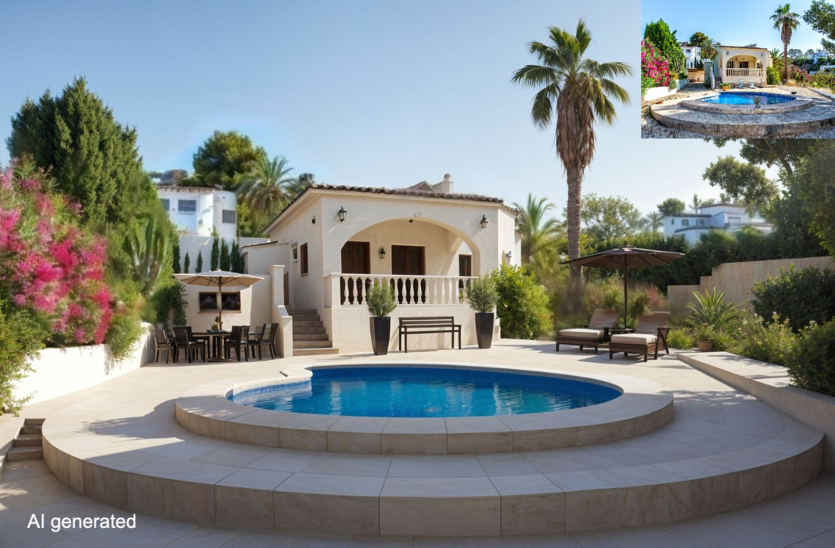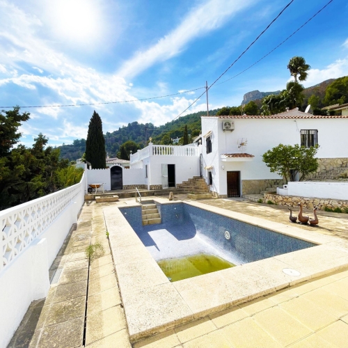 Mediterranean villa for sale; quietly located on a cul-de-sac in Empedrola in Calpe. Plenty of sun due to its south-facing position with a little sea view (this view can be improved by pruning the pine trees on the property).