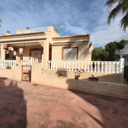 Cozy single-storey chalet with a rooftop solarium, accessible via an exterior staircase from the garden.