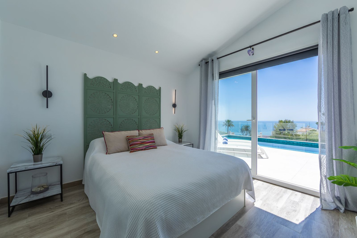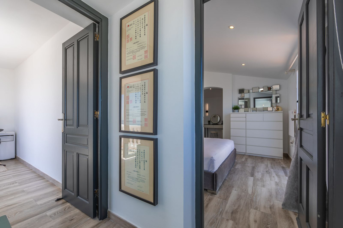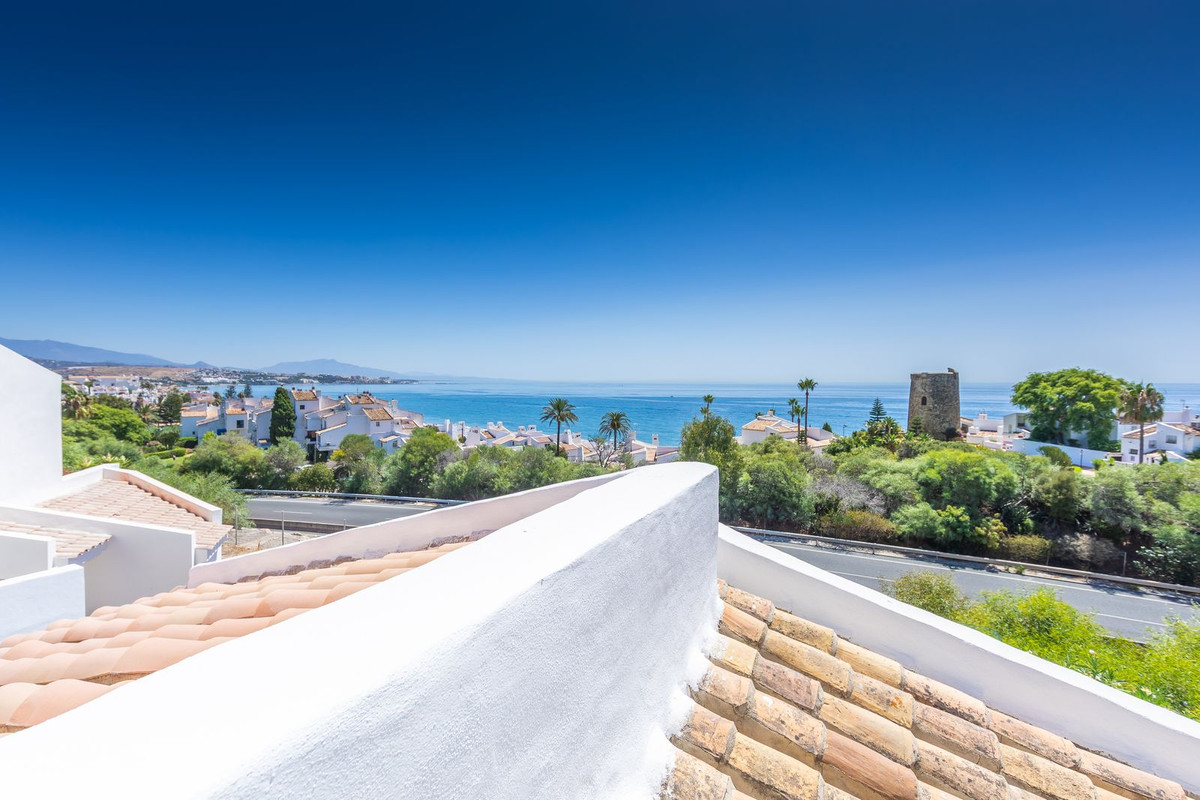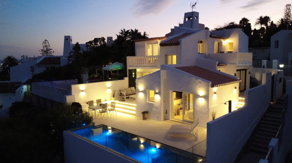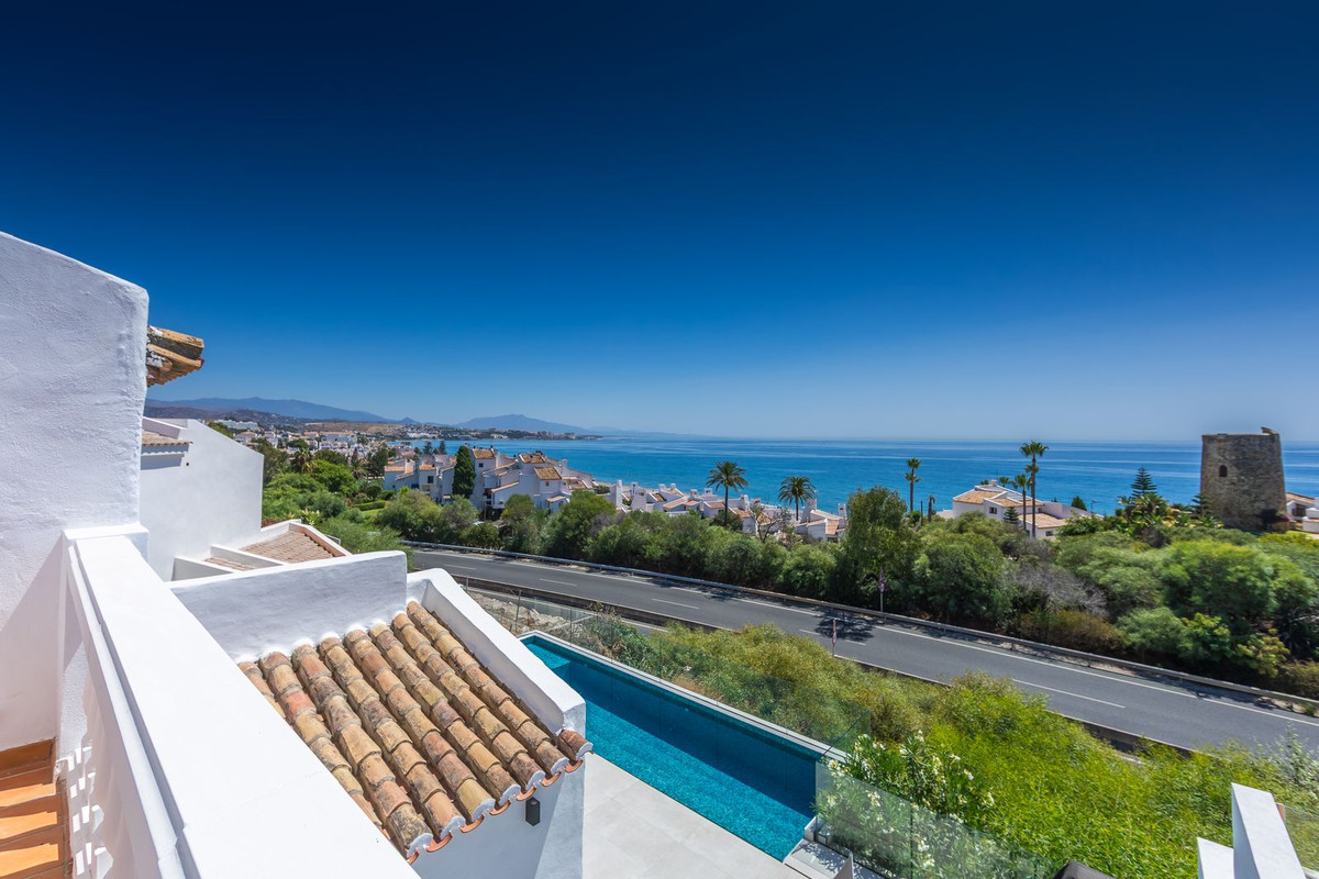 Modern and elegant villa with extraordinary panoramic views of the sea, the mountains, Gibraltar, and Africa, located in a privileged area with direct access to beautiful beaches via a convenient footbridge or an easy underground tunnel. This property is part of a unique architectural complex designed by renowned European architect Aubrey David, widely awarded for his innovative and aesthetic approach. Set within a well-established and meticulously maintained residential community, it offers access to six communal swimming pools, mature gardens, a gym, and a tennis court. Each villa in the complex features a unique design and layout, adding to the exclusive character of the community. The villa enjoys an excellent location, just a short drive from Estepona, La Duquesa, and Sabinillas, and well connected to Sotogrande, Marbella, Gibraltar, and Málaga Airport. All essential services, supermarkets, schools, and the new hospital are conveniently close, just 2 km away. Ideal for golf enthusiasts, the property is next to Estepona Golf and close to prestigious courses such as Finca Cortesin. Facing southeast and recently renovated, the villa retains its charming original rustic style. It is laid out over several levels, allowing for an abundance of natural light through its many windows. The home features several terraces with different orientations, a private pool, and a spacious covered parking area. Holiday rentals are allowed, with a 20% supplement applied to the community fee. A property full of character, charm, and an unbeatable location. Highly recommended for viewing.