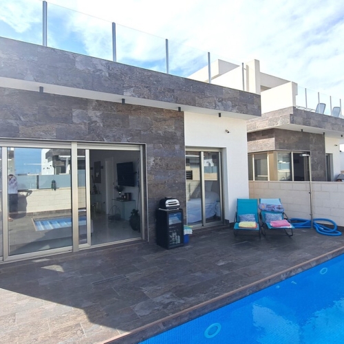 Detached villa located in one of the best areas of Villamartín, just a few meters from the entrance to the golf course. With a constructed area of 189 m² spread over two floors plus a basement, and a 240 m² plot, this property offers spaciousness, comfort, and excellent orientation.. . The home has a total of 4 bedrooms and 3 bathrooms. On the ground floor, we find a bright, generously sized living-dining room, a spacious, fully equipped independent kitchen, a bedroom, and a full bathroom. Upstairs is the master bedroom with a dressing room, en-suite bathroom with sauna, and a large terrace with unobstructed views.. . The basement, with independent access, has two additional bedrooms, a full bathroom, and a second living room, ideal for guests or as an additional private space.. . Outside, the property offers a private garden, driveway, barbecue area, and a relaxing jacuzzi located at the rear, perfect for enjoying the Mediterranean climate.. . It is sold furnished and equipped with air conditioning. An ideal home for both permanent residence and vacation, in a prime location close to golf courses, amenities, and beaches.