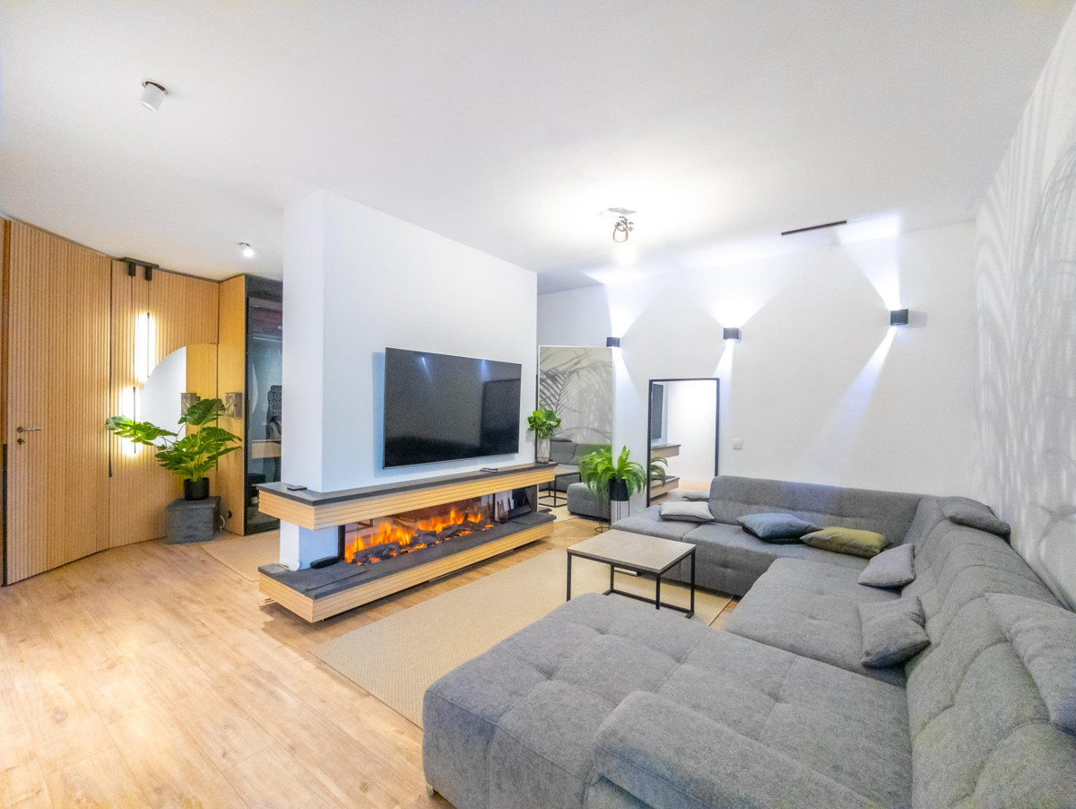 The house offers 163m2 of built-up area, spread over two floors. At the entrance, we find a hall. It has a spacious and modern living room next to the furnished dining room, also featuring a radiant fireplace. A separate kitchen with a modern style in dark tones is fully equipped. It has 3 bedrooms with built-in wardrobes and 2 modern bathrooms. It has a room designated as a dressing room. It also has a storage room, perfect for keeping the house tidy. It also has a 20m2 terrace and a 30m2 solarium on the roof with beautiful views of the garden.