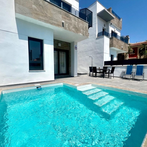 I present this renovated detached villa with a huge garden and a saltwater pool. The garden has a 1038m2 plot. It is located in the Chaparral area of Torrevieja.