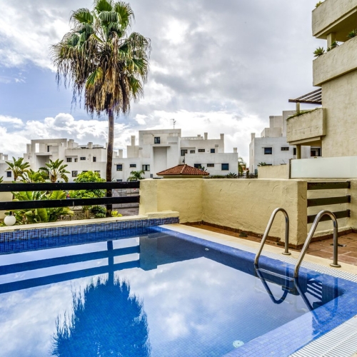 Discover this charming ground-floor apartment located in an exclusive residential complex in El Paraíso, Estepona. A unique opportunity to enjoy the Mediterranean lifestyle, surrounded by gardens, peace, and just minutes away from the best beaches, golf courses, and amenities. Just a 5-minute walk to El Campanario Club House, offering: