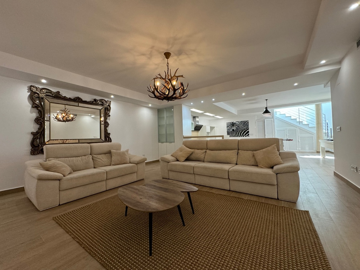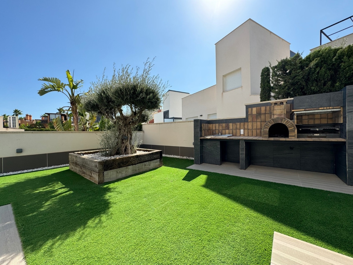 This newly built luxury villa contains 5 spacious bedrooms and 4 modern bathrooms, carefully arranged over two floors and a basement, all seamlessly connected by a practical lift and an elegant glass staircase with soft interior lighting. The basement is dedicated to entertaining and includes a game room (with pool table and football table), party room with full kitchen, two additional bedrooms, two storage rooms and a full bathroom. The ground floor consists of an open-plan living and dining room with a central kitchen with an island, a master bedroom with en-suite bathroom, as well as a utility room and guest toilet. On the first floor you will find two large bedrooms, two further bathrooms and access to private balconies. The top floor opens to a spectacular 70 m² solarium with breathtaking panoramic views.Premium Features and Interface The villa is fully equipped with air conditioning, central heating and underfloor heating and is sold fully furnished with design work, excluding personal items. Luxurious amenities include motorized sofas, brand new mattresses, a pyrolysis steam oven, a combined refrigerator/ice maker, solar panels and a pellet stove for eco-friendly heating. Security is paramount, with reinforced windows and doors, security keys and a sensor-based alarm system.Outdoor Paradise Step into the carefully landscaped garden with a private pool with waterfall, jacuzzi and hydromassage jets. Around the pool there is a lush green area, an outdoor shower and a large parking lot for several cars.Location – Bellavista Residence Residencial Bellavista is located in the quiet and picturesque neighborhood of San Miguel de Salinas and offers some of the most beautiful views of the Costa Blanca. Located just 7 km from the beautiful beaches of Orihuela, close to the best golf courses and a large shopping center with all the necessary services, restaurants and shops, this property is ideal for those who value both nature and tranquility.