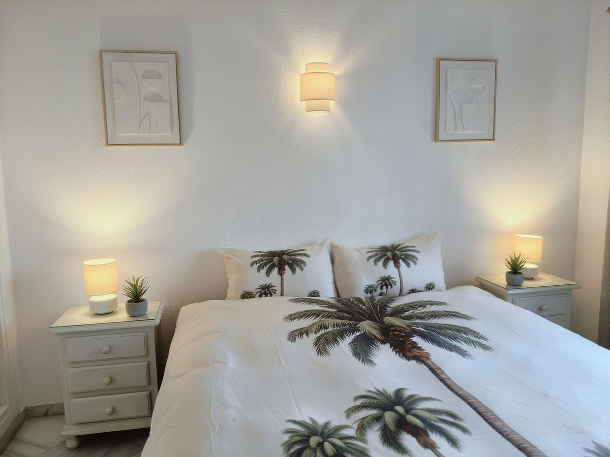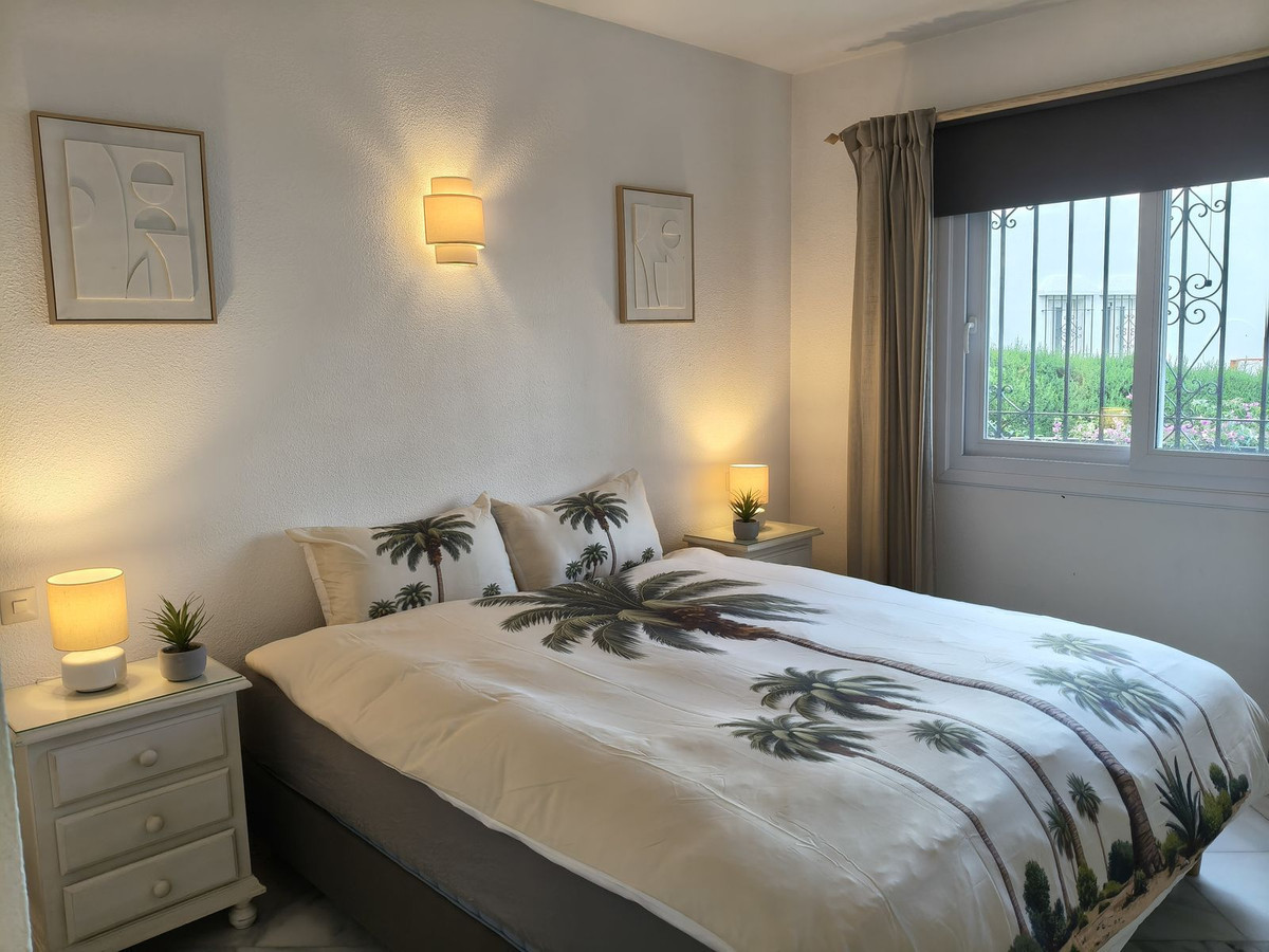 The Master bedroom with a super king bed equipped with double panelled wardrobes and offers views to the tropical gardens - Adjacent luxurious Andalucian master bathroom designed with an immaculate white marble integrated vanity unit with purpose built white carpentry, a porcelain bathtub with shower, double windows and integrated spots to the ceiling. A further guest bedroom with ensuite bathroom offers 2 beds with beautiful garden views.