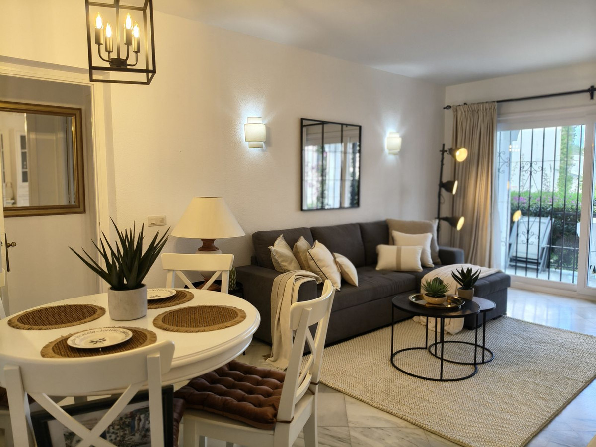 Exquisitely positioned corner status one level elevated ground floor apartment with a high interior specification fully furnished with modern furniture, offering access to a spacious immaculately maintained tropical garden situated within a prestigious community in El Paraiso Alto Benahavis, designed within tall palm residents gardens, encapsulated by the surrounding El Paraiso hills and mountains an area of outstanding natural beauty and tranquillity consistently chosen by industry professionals as a highly recommended golf, vacation and residential choice offering direct access from the exclusive community car park onto the famous El Paraiso 18 hole golf course green.