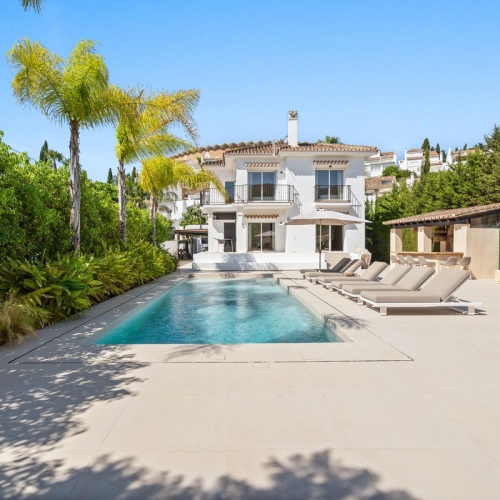 This lovely four-bedroom, newly renovated villa is located in the residential area of Nueva Andalucía, within the secure, gated community of Marbella Country Club.