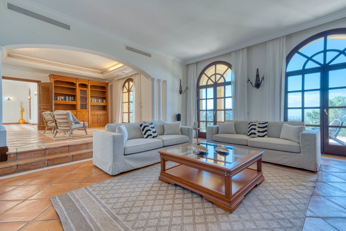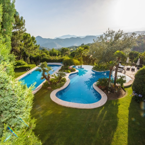 Step into timeless luxury with this magnificent and extremely private six-bedroom villa located in one of Europe's most prestigious private gated estates. Set on an expansive 6,173m² plot, this impressive residence offers complete privacy, breathtaking views of the Mediterranean and surrounding mountains, and over 970m² of refined living space. A sweeping driveway leads to the grand entrance and an underground garage for three cars. Inside, a striking central atrium fills the home with natural light, seamlessly connecting the fully fitted kitchen, formal dining area, and sunken lounge, designed for both elegant entertaining and relaxed family living. The main level features three generously sized bedroom suites, and on the lower level, the home transforms into a private retreat, boasting a stylish lounge and bar area, second kitchen, games room, gymnasium, sauna, steam room, and three additional bedroom suites with direct garden access.