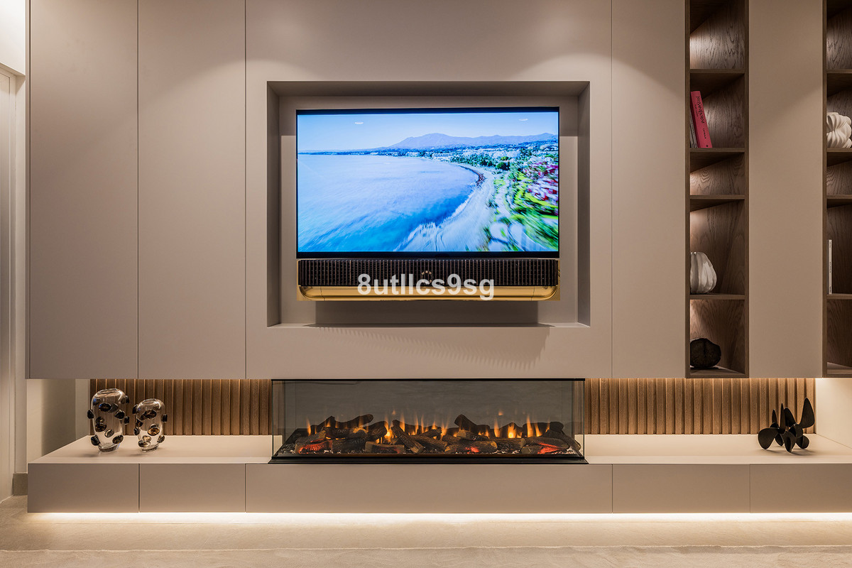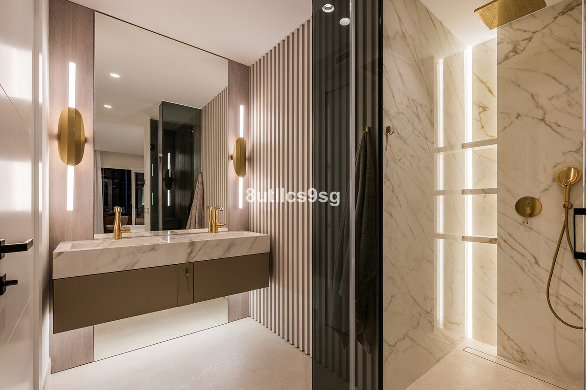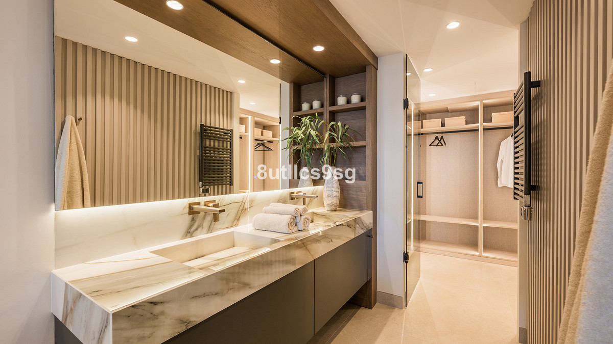 The apartment features four bedrooms and four bathrooms, three of which are en-suite, providing ample accommodation for families or guests. The interior is finished to an excellent standard, including porcelain floors, double glazing, air conditioning, and a fireplace. The fully fitted kitchen and separate utility room add convenience, while fitted wardrobes offer practical storage solutions throughout the property.