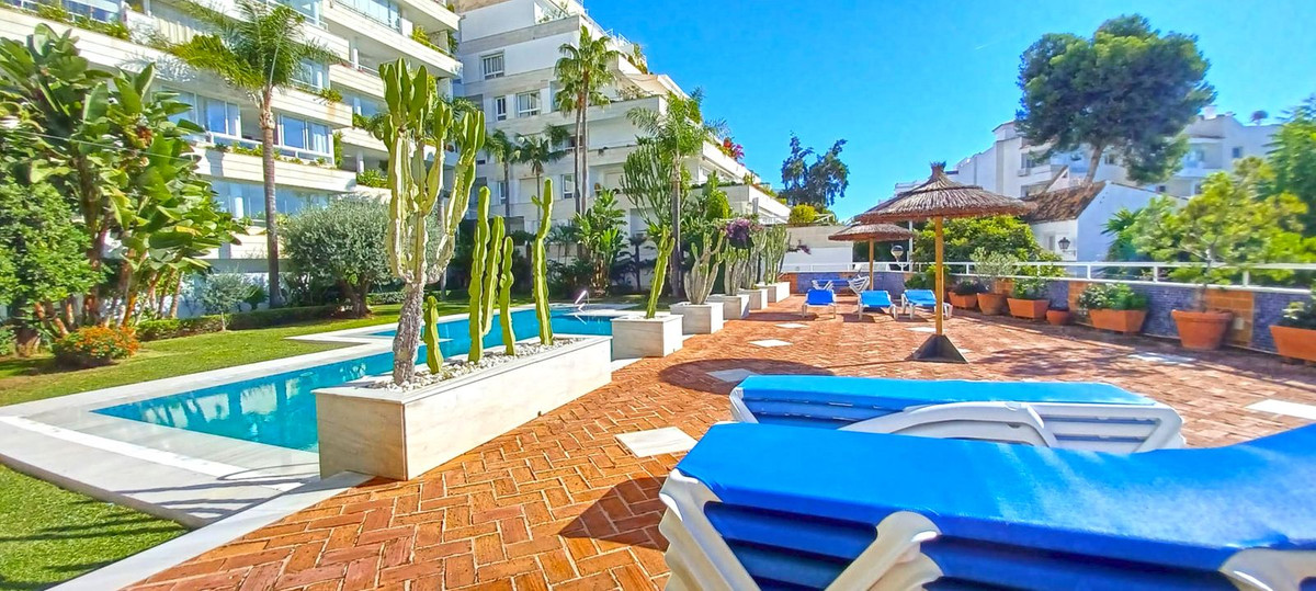 Discover this spacious and bright flat in an iconic building with an exceptional location just 30 metres from the seafront promenade and surrounded by all kinds of shops, cafés, restaurants and services such as private clinics, health centres, public transport, etc. The apartment is part of a fully enclosed community and, in addition to a concierge service, has well-maintained communal areas and a swimming pool surrounded by beautiful communal gardens with a solarium. A property that undoubtedly offers everything you need to enjoy life in Marbella by the sea. It has a total built area of 113 m2 plus communal areas and a garage space not included in the price (45.000€). It is distributed in an entrance hall, a fully furnished kitchen equipped with Siemens appliances with access to a terrace, a spacious living-dining room with 2 exits to terraces, one of which is enclosed and glazed with Lumon and fitted out as a summer dining room, a master bedroom with fitted wardrobes and en-suite bathroom, and a second bedroom with fitted wardrobe and bathroom. There is also the possibility of easily converting a space into a third bedroom, adapting it to your needs. Good quality construction. Hot and cold air conditioning, intercom, double-glazed windows. Marble floors. Optional furniture. This property is not only ideal for living by the sea and its promenade in one of the most privileged areas of Marbella, but also an excellent investment opportunity in a property that is constantly increasing in value and offering high rental yields.