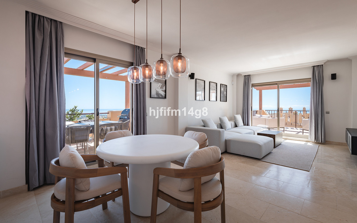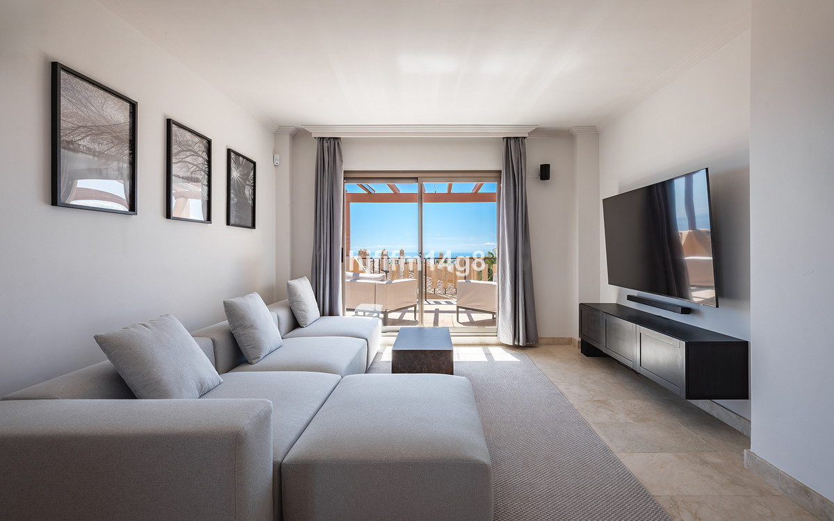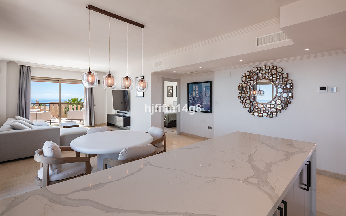 Denna lyxiga takvåning på en våning erbjuder enastående panoramautsikt över havet och bergen. Fastigheten har en entréhall som leder till ett rymligt vardagsrum och matsal, som öppnar upp mot två terrasser: en som vetter mot sydost med utsikt över La Concha-berget, Atalaya Golfbana och Medelhavet; den andra som vetter mot söder/sydväst och visar upp svepande vyer över havet, Gibraltar och Nordafrikas kust.