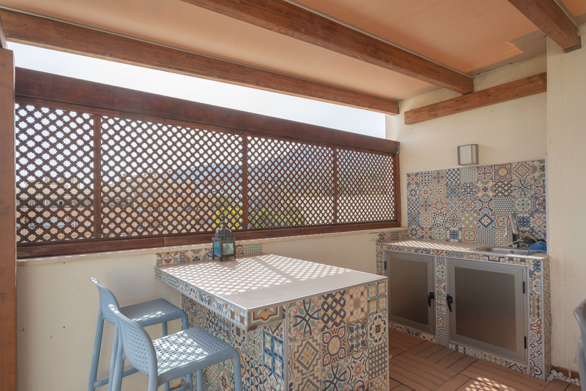 Bostaden har 4 sovrum, 2 fullstora badrum, ett rymligt separat kök med tvättavdelning samt ett ljust vardagsrum med matsalsdel och direkt tillgång till en 110 m² stor terrass – perfekt för att umgås med familj eller vänner. Dessutom finns en andra takterrass på 114 m² som fungerar som solterrass med chill-out-område och plats för utomhusaktiviteter, med idyllisk utsikt över både havet och bergen.